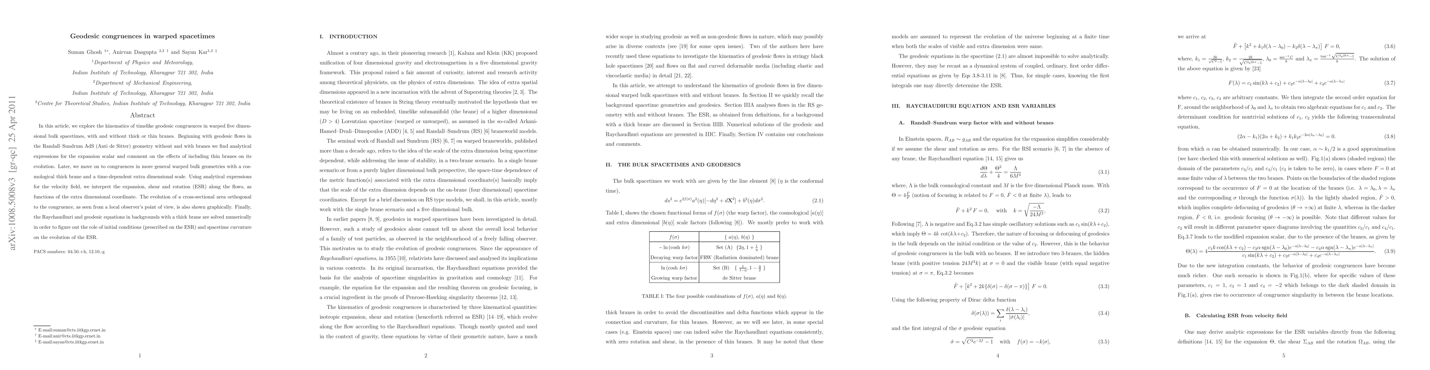 This paper investigates the kinematics of timelike geodesic congruences in warped five-dimensional spacetimes, analyzing the expansion scalar in Randall-Sundrum AdS geometries with and without branes, and solving the Raychaudhuri and geodesic equations numerically to understand the influence of initial conditions and spacetime curvature on the evolution of the expansion, shear, and rotation.