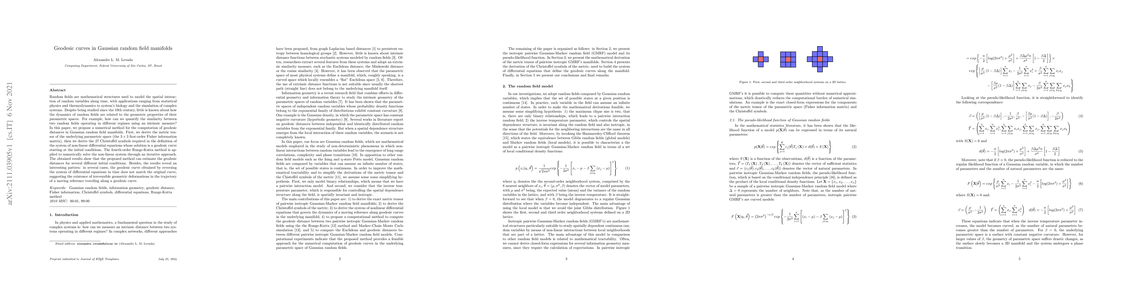 Researchers developed a method to calculate geodesic distances in Gaussian random field manifolds, revealing irreversible geometric deformations in the trajectory of moving references along geodesic curves.