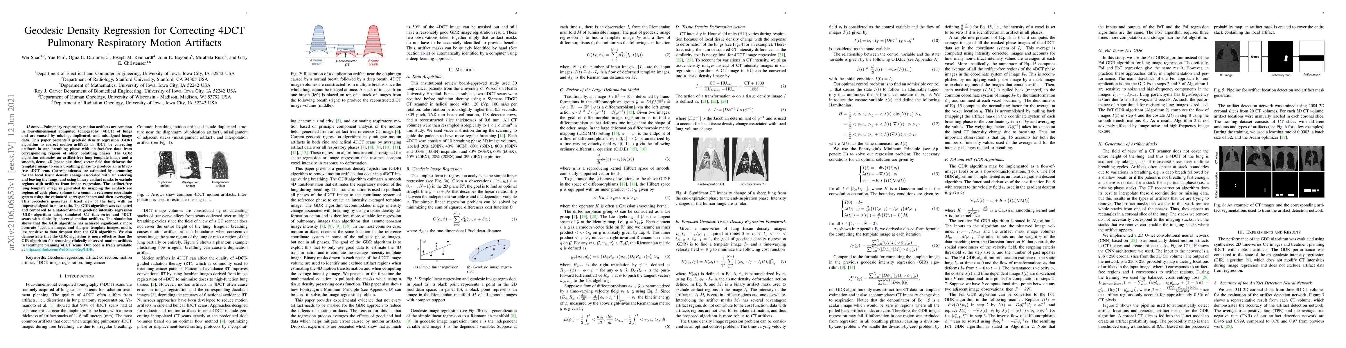This paper introduces a geodesic density regression (GDR) algorithm to correct respiratory motion artifacts in 4DCT scans by using artifact-free data from other breathing phases. The GDR algorithm generates an improved lung template and outperforms geodesic intensity regression in simulations and clinical scans.