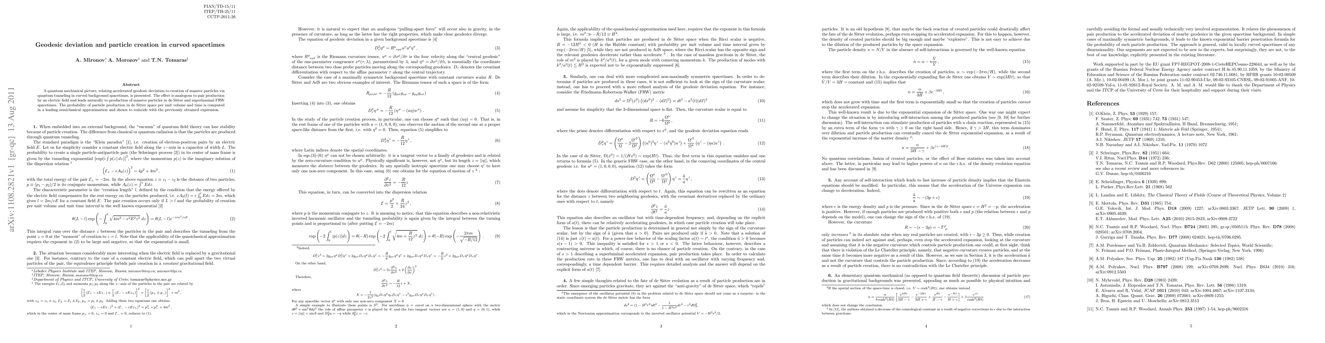 This paper explores how accelerated geodesic deviation in curved spacetimes can lead to the creation of massive particles through quantum tunneling, analogous to pair production in electric fields, and computes the probability of such particle production in de Sitter and superluminal FRW spacetimes. The results align with previously derived expressions.