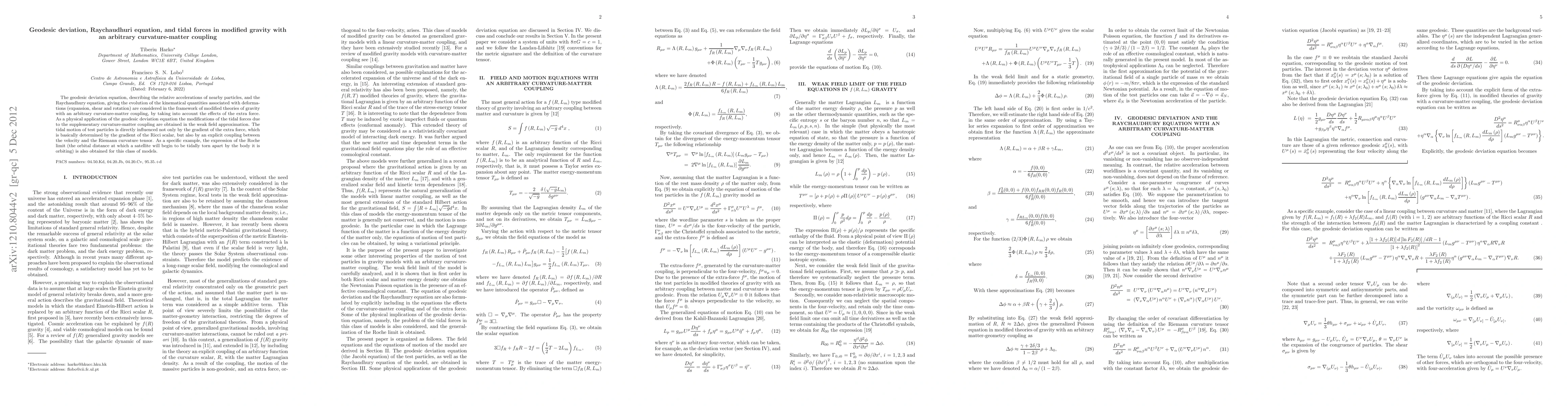 The geodesic deviation equation, describing the relative accelerations of nearby particles, and the Raychaudhury equation, giving the evolution of the kinematical quantities associated with deformations (expansion, shear and rotation) are considered in the framework of modified theories of gravity with an arbitrary curvature-matter coupling, by taking into account the effects of the extra force. As a physical application of the geodesic deviation equation the modifications of the tidal forces due to the supplementary curvature-matter coupling are obtained in the weak field approximation. The tidal motion of test particles is directly influenced not only by the gradient of the extra force, which is basically determined by the gradient of the Ricci scalar, but also by an explicit coupling between the velocity and the Riemann curvature tensor. As a specific example, the expression of the Roche limit (the orbital distance at which a satellite will begin to be tidally torn apart by the body it is orbiting) is also obtained for this class of models.