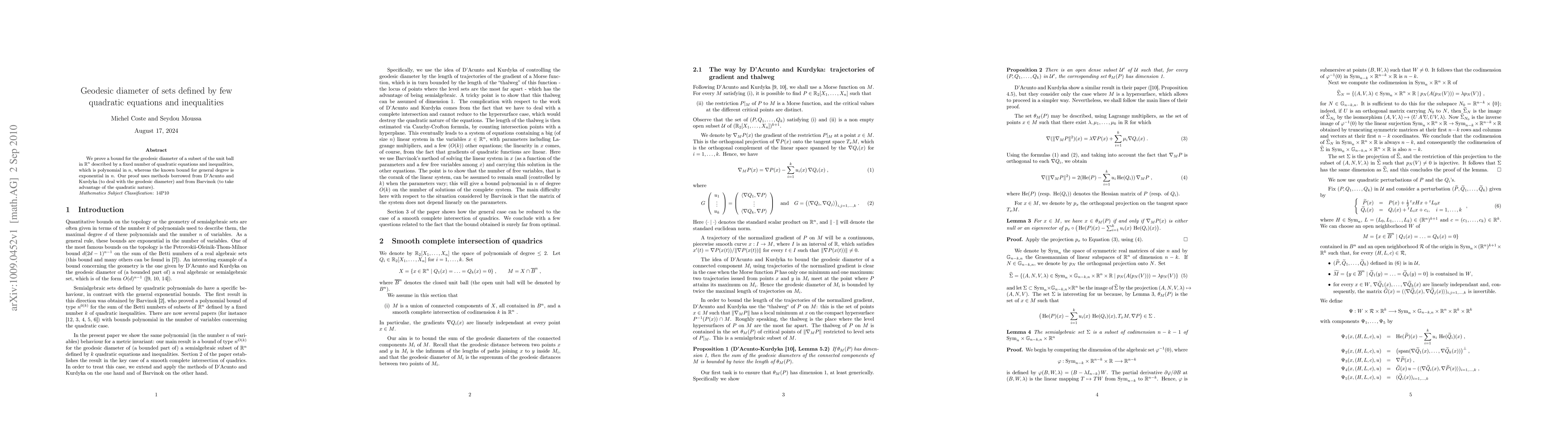 This research establishes a polynomial bound for the geodesic diameter of specific subsets within the unit ball in (mathbb{R}^n), defined by a fixed number of quadratic equations and inequalities. This improves upon the exponential bound known for general degree, leveraging methods from D'Acunto & Kurdyka and Barvinok.
