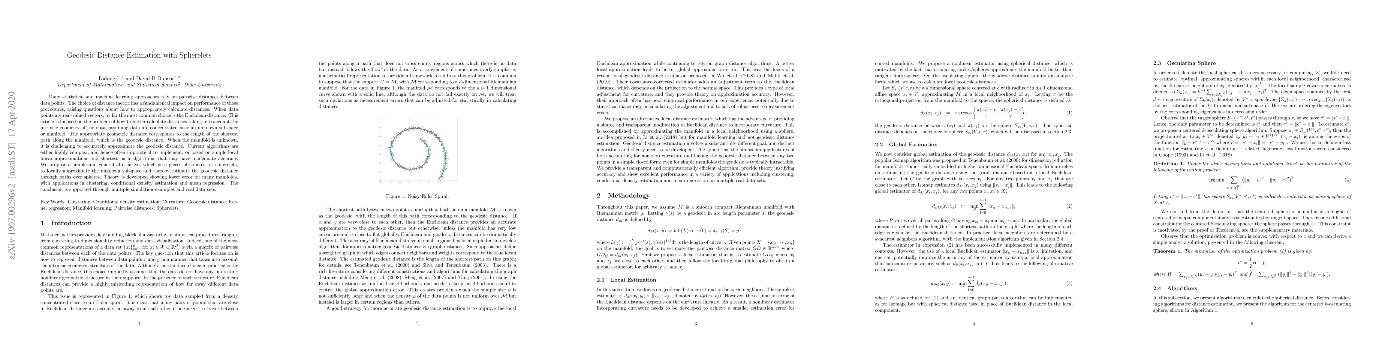 Many statistical and machine learning approaches rely on pairwise distances between data points. The choice of distance metric has a fundamental impact on performance of these procedures, raising questions about how to appropriately calculate distances. When data points are real-valued vectors, by far the most common choice is the Euclidean distance. This article is focused on the problem of how to better calculate distances taking into account the intrinsic geometry of the data, assuming data are concentrated near an unknown subspace or manifold. The appropriate geometric distance corresponds to the length of the shortest path along the manifold, which is the geodesic distance. When the manifold is unknown, it is challenging to accurately approximate the geodesic distance. Current algorithms are either highly complex, and hence often impractical to implement, or based on simple local linear approximations and shortest path algorithms that may have inadequate accuracy. We propose a simple and general alternative, which uses pieces of spheres, or spherelets, to locally approximate the unknown subspace and thereby estimate the geodesic distance through paths over spheres. Theory is developed showing lower error for many manifolds, with applications in clustering, conditional density estimation and mean regression. The conclusion is supported through multiple simulation examples and real data sets.