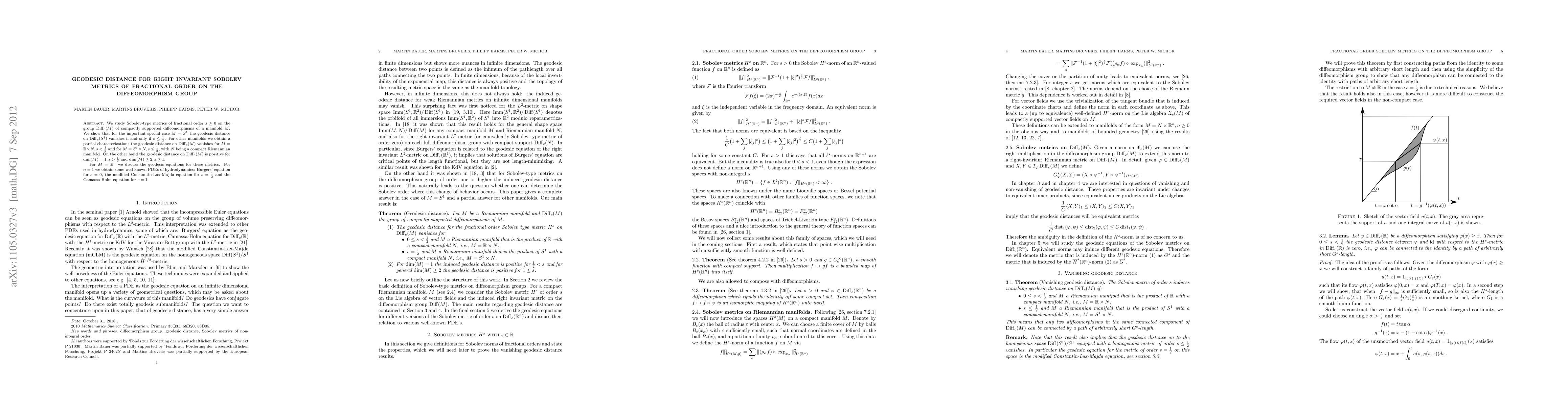 The paper studies Sobolev-type metrics of fractional order on diffeomorphism groups, finding that geodesic distance vanishes for specific cases, particularly when the dimension is 1 or less than half the order of the metric.
