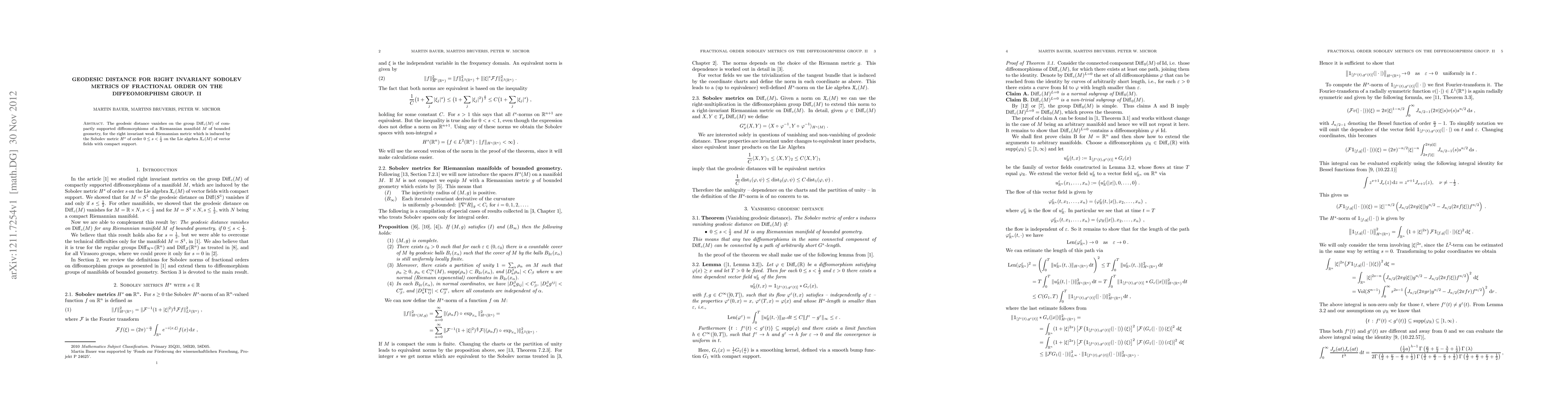 The geodesic distance vanishes on the group of compactly supported diffeomorphisms of a Riemannian manifold $M$ of bounded geometry, for the right invariant weak Riemannian metric which is induced by the Sobolev metric $H^s$ of order $0\le s<\tfrac12$ on the Lie algebra $\mathfrak X_c(M)$ of vector fields with compact support.