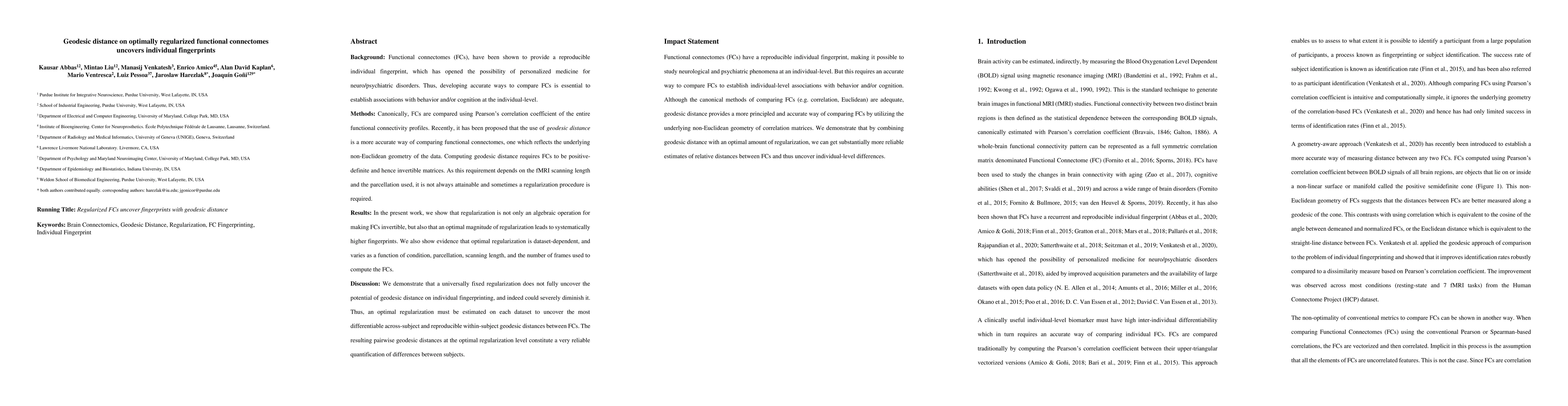 Geodesic distance on optimally regularized functional connectomes reveals individual fingerprints with higher accuracy than Pearson's correlation coefficient, requiring optimal regularization for dataset-dependent results.