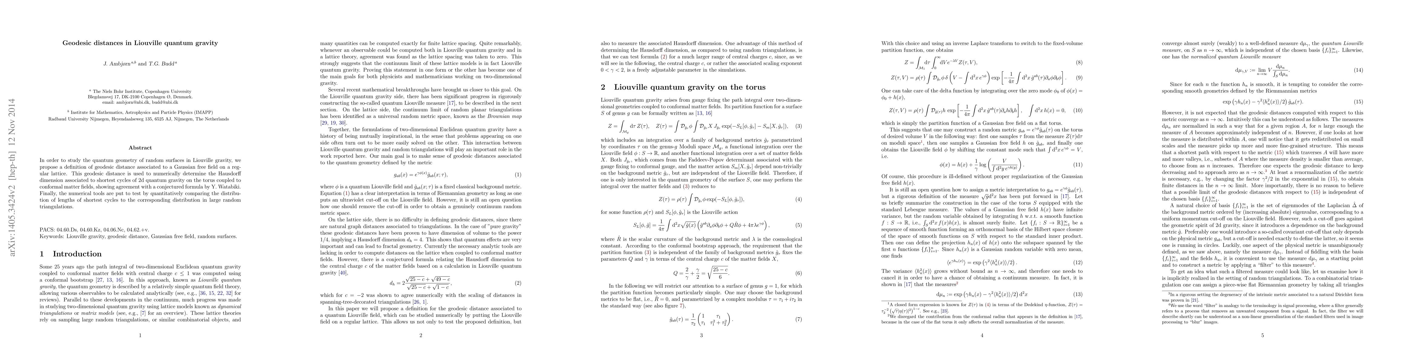 The paper introduces a method to define and compute geodesic distances in the context of Liouville quantum gravity using Gaussian free fields on regular lattices, along with numerical techniques to estimate the Hausdorff dimension.