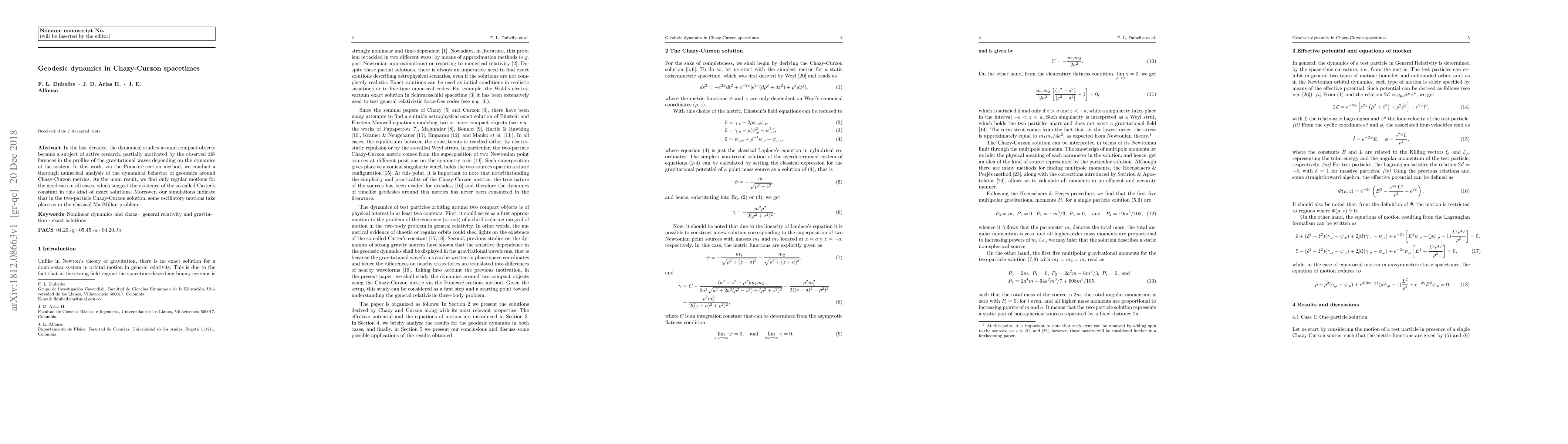 Researchers analyzed geodesic dynamics in Chazy-Curzon spacetimes, finding that only regular motions occur, suggesting the existence of a constant similar to Carter's constant, and observing oscillatory behavior in a two-particle solution.