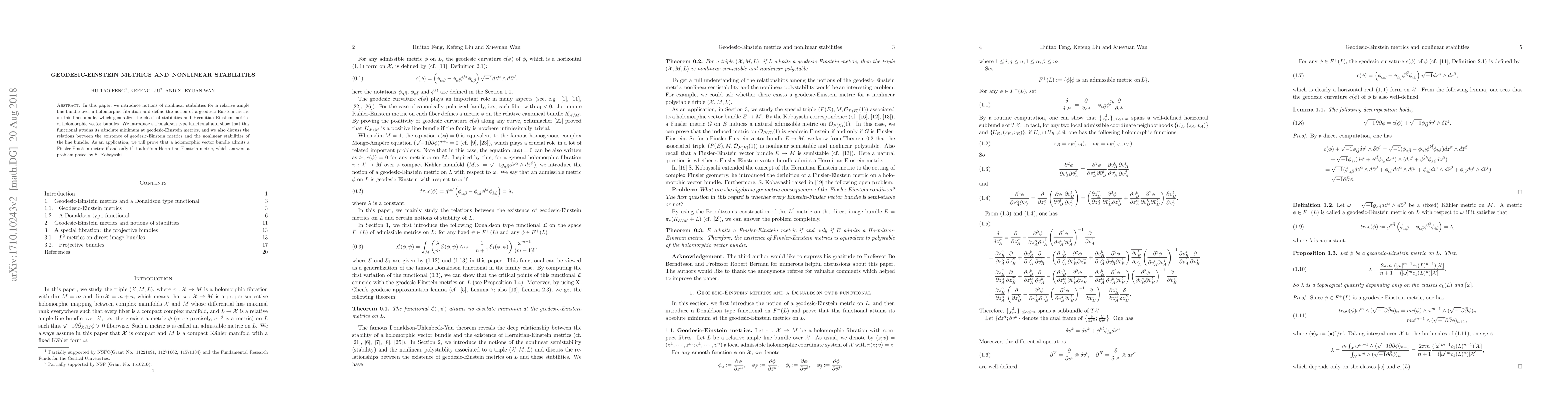 This paper introduces geodesic-Einstein metrics for line bundles over holomorphic fibrations, linking them to nonlinear stabilities and solving a problem posed by S. Kobayashi.