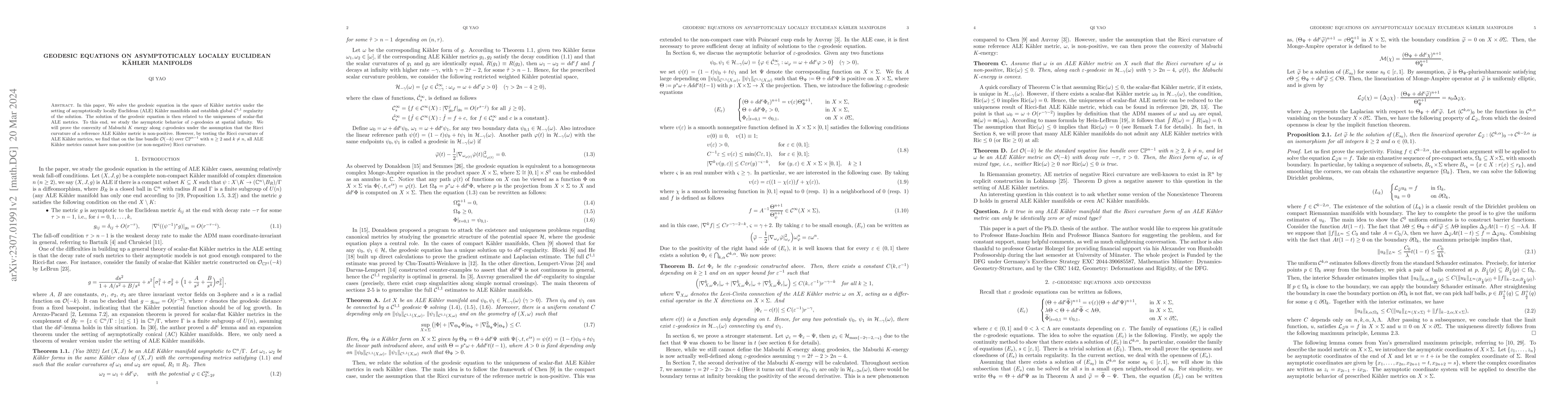 We solve the geodesic equation in the space of K\"ahler metrics under the setting of asymptotically locally Euclidean (ALE) K\"ahler manifolds and we prove global $\mathcal{C}^{1,1}$ regularity of the solution. Then, we relate the solution of the geodesic equation to the uniqueness of scalar-flat ALE metrics. To this end, we study the asymptotic behavior of $\varepsilon$-geodesics at spatial infinity. Under the assumption that the Ricci curvature of a reference ALE K\"ahler metric is non-positive, convexity of the Mabuchi $K$-energy along $\varepsilon$-geodesics. However, we will also prove that on the line bundle $\mathcal{O}(-k)$ over $\mathbb{C}\mathbb{P}^{n-1}$ with $n \geq 2$ and $k \neq n$, no ALE K\"ahler metric can have non-positive (or non-negative) Ricci curvature.