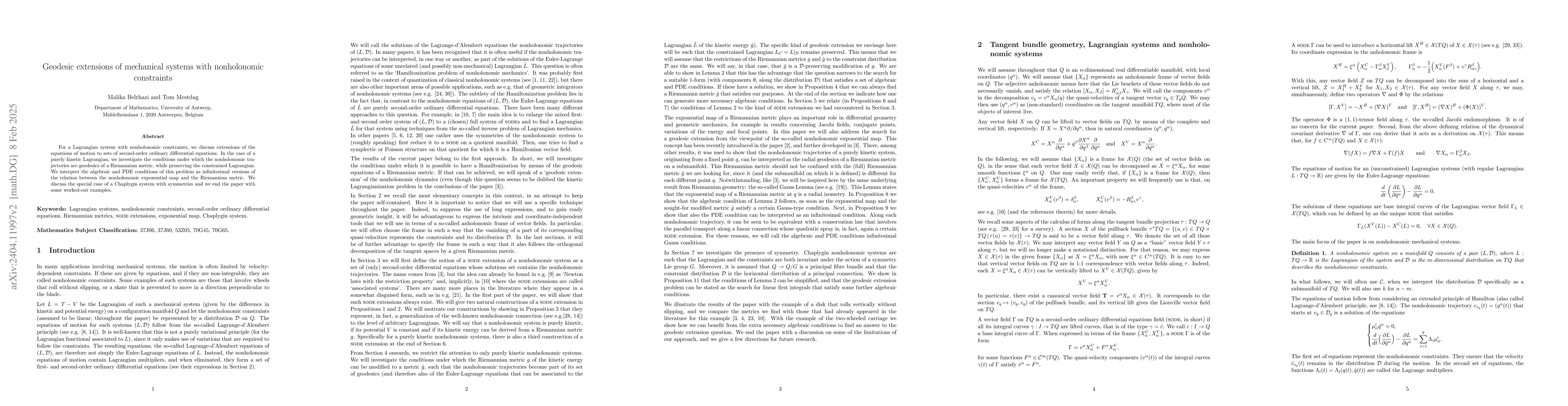 This paper constructs extensions of nonholonomic mechanical systems' equations of motion into second-order differential equations and explores when constrained trajectories are Riemannian geodesics. It interprets the algebraic and PDE conditions as relations between the nonholonomic exponential map and Riemannian metrics, and concludes with a Chaplygin system example.
