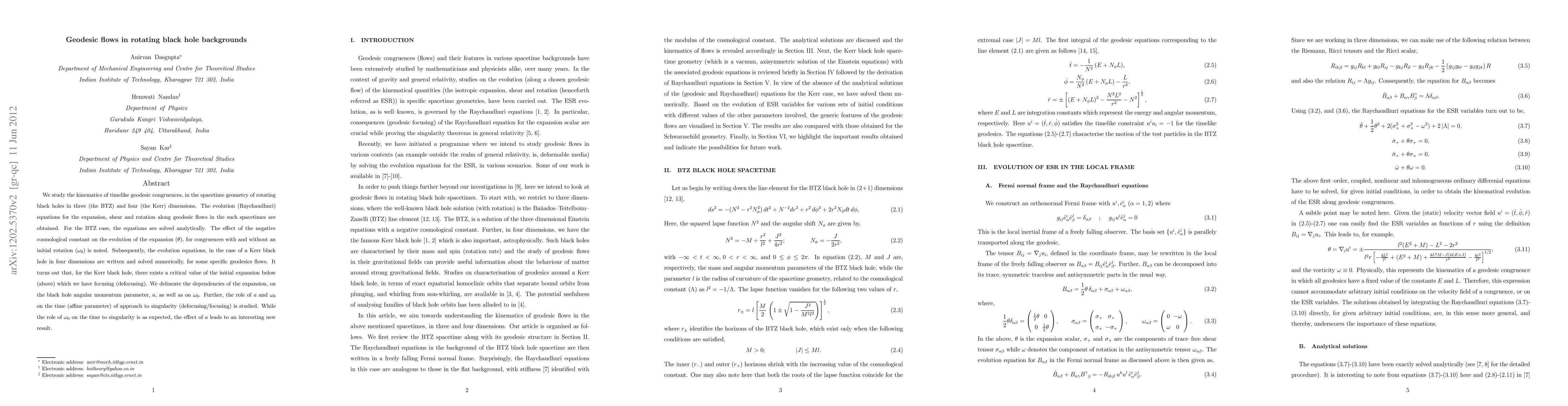 We study the kinematics of timelike geodesic congruences, in the spacetime geometry of rotating black holes in three (the BTZ) and four (the Kerr) dimensions. The evolution (Raychaudhuri) equations for the expansion, shear and rotation along geodesic flows in such spacetimes are obtained. For the BTZ case, the equations are solved analytically. The effect of the negative cosmological constant on the evolution of the expansion ($\theta$), for congruences with and without an initial rotation ($\omega_0$) is noted. Subsequently, the evolution equations, in the case of a Kerr black hole in four dimensions are written and solved numerically, for some specific geodesics flows. It turns out that, for the Kerr black hole, there exists a critical value of the initial expansion below (above) which we have focusing (defocusing). We delineate the dependencies of the expansion, on the black hole angular momentum parameter, $a$, as well as on $\omega_0$. Further, the role of $a$ and $\omega_0$ on the time (affine parameter) of approach to a singularity (defocusing/focusing) is studied. While the role of $\omega_0$ on this time of approach is as expected, the effect of $a$ leads to an interesting new result.