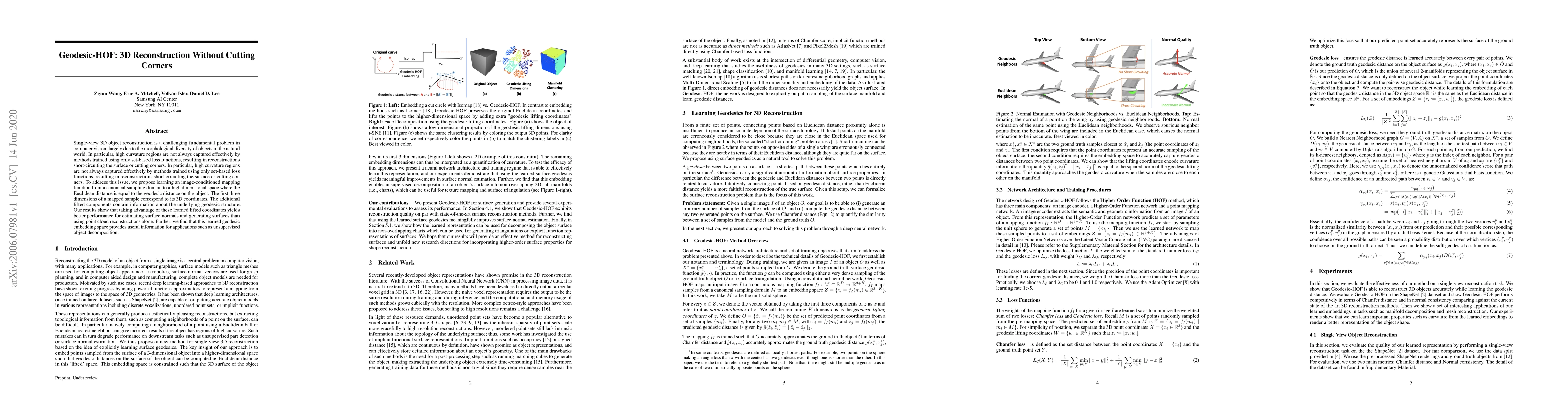 A new method called Geodesic-HOF improves 3D object reconstruction by learning a mapping function that captures high curvature regions more accurately than existing methods. This leads to better surface normal estimation and surface generation.