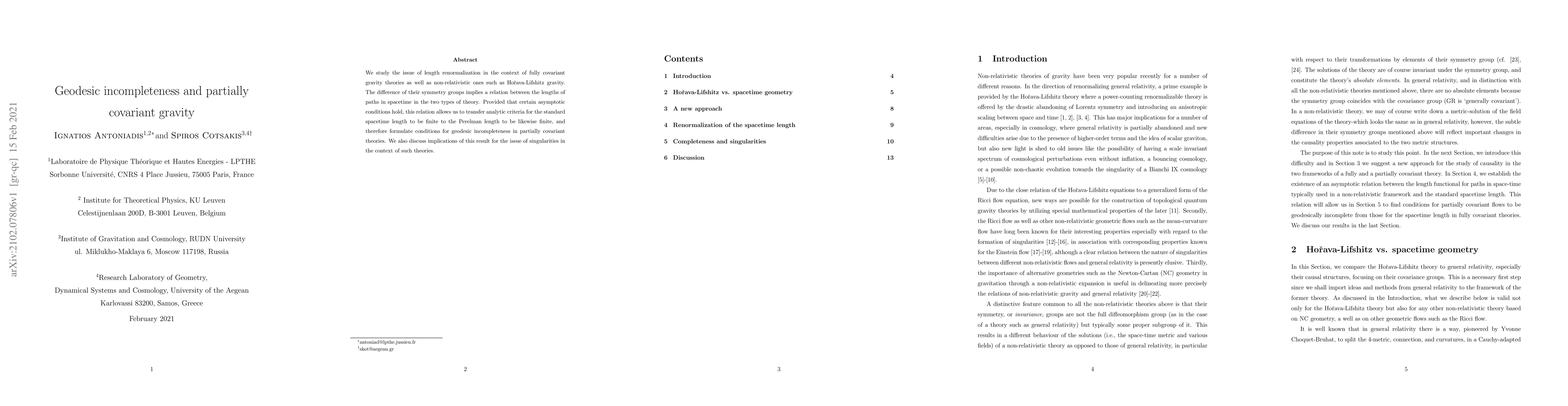 We study the issue of length renormalization in the context of fully covariant gravity theories as well as non-relativistic ones such as Ho\v{r}ava-Lifshitz gravity. The difference of their symmetry groups implies a relation between the lengths of paths in spacetime in the two types of theory. Provided that certain asymptotic conditions hold, this relation allows us to transfer analytic criteria for the standard spacetime length to be finite to the Perelman length to be likewise finite, and therefore formulate conditions for geodesic incompleteness in partially covariant theories. We also discuss implications of this result for the issue of singularities in the context of such theories.