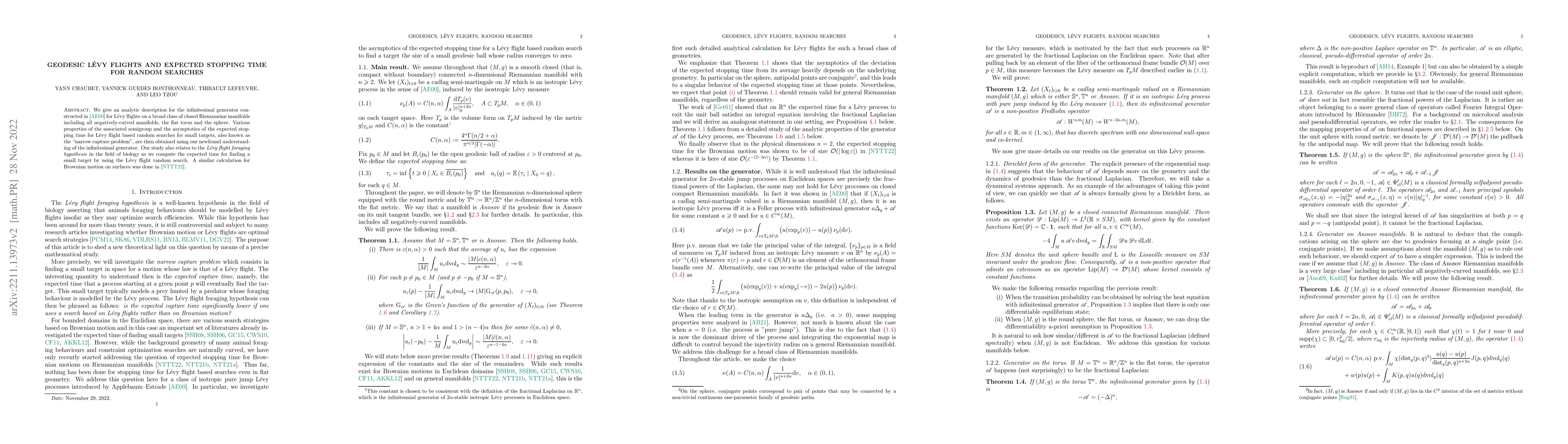 This paper analytically describes the infinitesimal generator for Lévy flights on various closed Riemannian manifolds, deriving properties of the associated semigroup and the expected stopping time for Lévy flight-based random searches. It also connects these findings to the Lévy flight foraging hypothesis in biology.