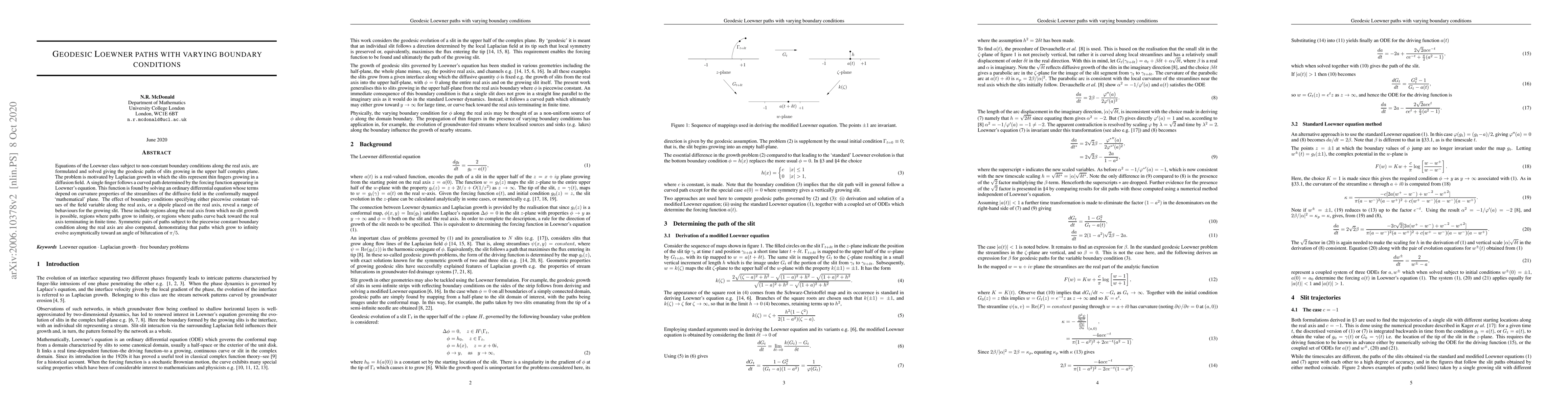 This paper formulates and solves Loewner equations with non-constant boundary conditions, revealing geodesic paths of slits growing in the upper half-plane, inspired by Laplacian growth in diffusion fields. The study finds varying slit behaviors, including regions of no growth, paths growing to infinity, and paths curving back to terminate, with symmetric pairs under piecewise constant conditions evolving asymptotically toward a bifurcation angle of π/5.