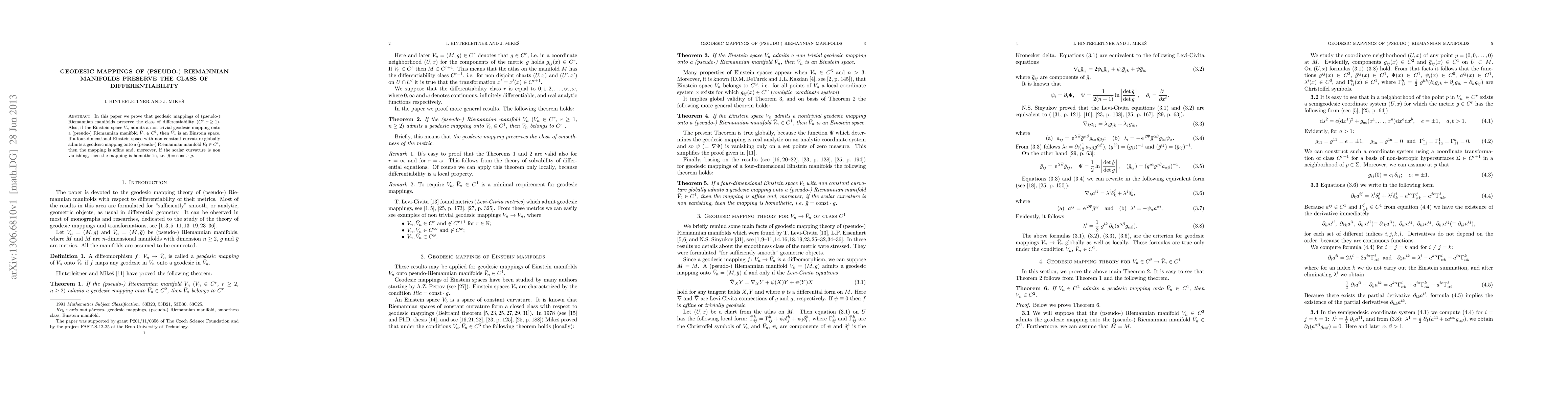 This paper demonstrates that geodesic mappings of (pseudo-) Riemannian manifolds maintain the class of differentiability $C^r$ for $r \geq 1$. It also shows that if a four-dimensional Einstein space admits a non-trivial geodesic mapping to a $C^1$ manifold, the mapping is affine and homothetic if the scalar curvature is non-vanishing.