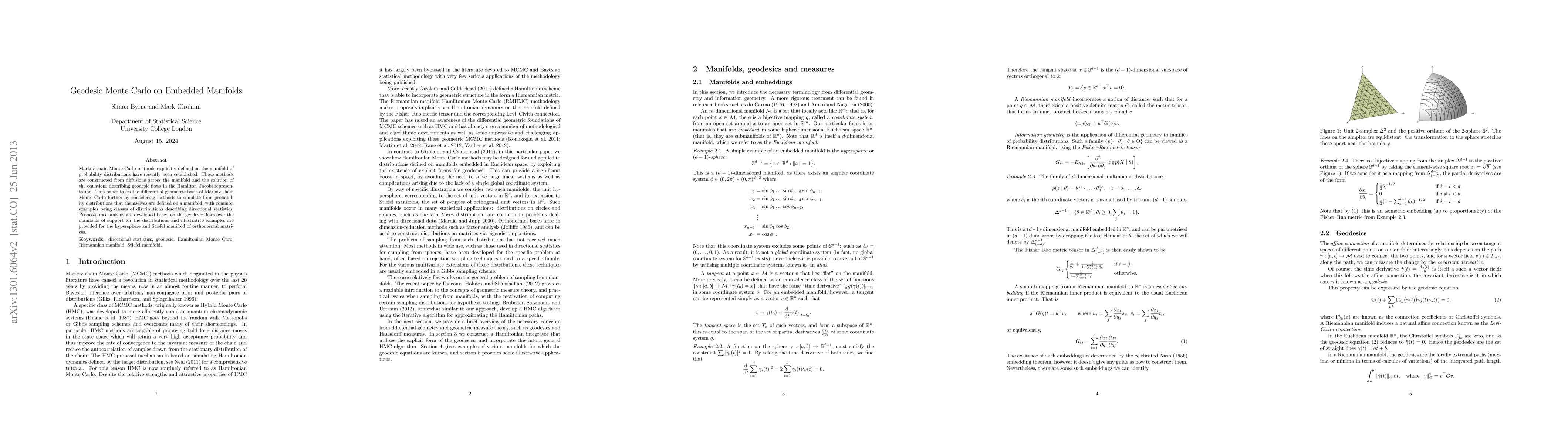 This paper advances Markov chain Monte Carlo methods by simulating from probability distributions defined on manifolds, utilizing geodesic flows and Hamilton-Jacobi equations. It proposes novel proposal mechanisms based on geodesics for distributions like directional statistics and provides examples on the hypersphere and Stiefel manifold.