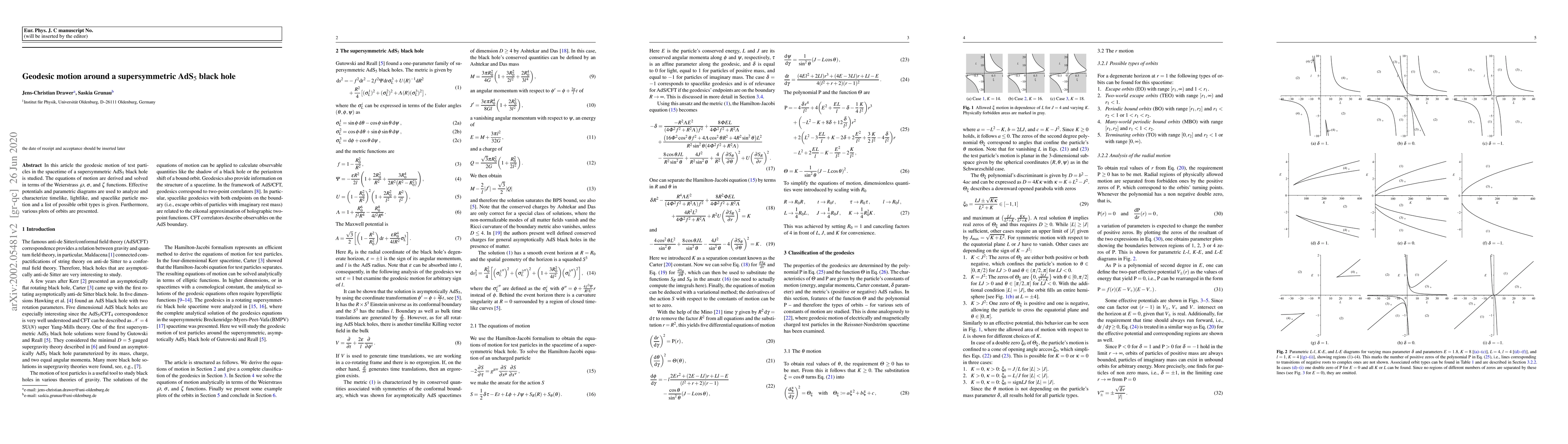 This paper studies the geodesic motion of test particles around a supersymmetric AdS$_5$ black hole, deriving and solving the equations of motion using Weierstrass functions. It analyzes timelike, lightlike, and spacelike orbits through effective potentials and parametric diagrams, presenting a comprehensive list of orbit types and illustrative plots.