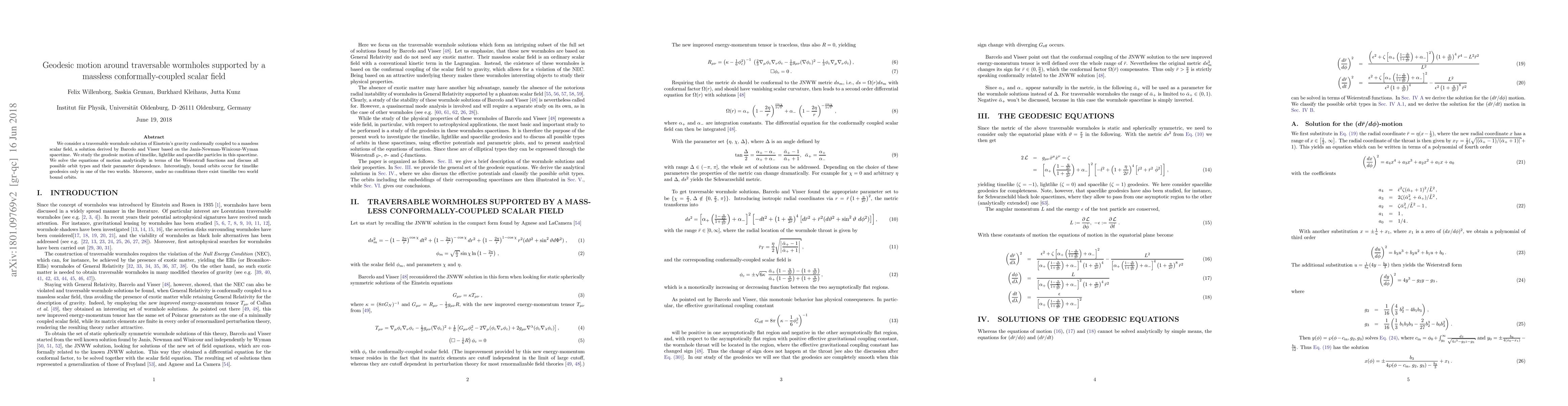 We consider a traversable wormhole solution of Einstein's gravity conformally coupled to a massless scalar field, a solution derived by Barcelo and Visser based on the JNWW spacetime. We study the geodesic motion of time-, light- and space-like particles in this spacetime. We solve the equations of motion analytically in terms of the Weierstra\ss \ functions and discuss all possible orbit types and their parameter dependence. Interestingly, bound orbits occur for time-like geodesics only in one of the two worlds. Moreover, under no conditions there exist time-like two world bound orbits.