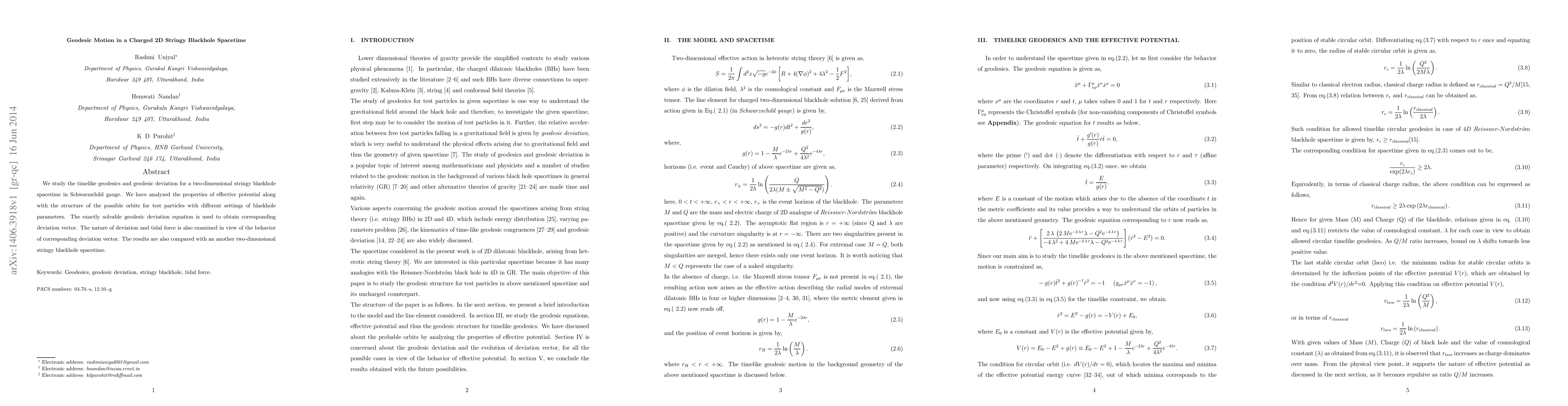 This paper investigates timelike geodesics and geodesic deviation in a charged 2D stringy blackhole spacetime, analyzing effective potential and orbit structures for test particles. It employs an exactly solvable geodesic deviation equation to study the nature of deviation and tidal forces, comparing results with another 2D stringy blackhole spacetime.