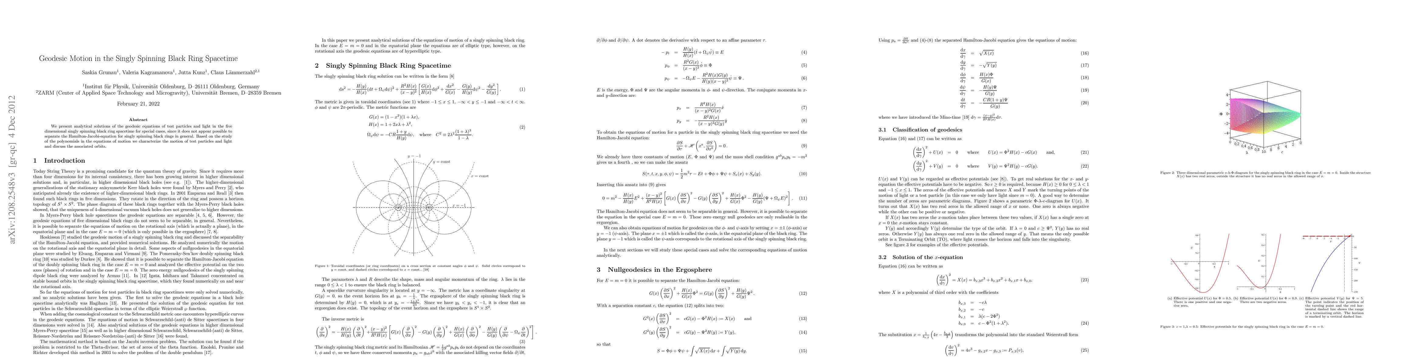 This paper provides analytical solutions for geodesics of test particles and light in the five-dimensional singly spinning black ring spacetime, focusing on special cases due to the complexity of the Hamilton-Jacobi equation. It characterizes the motion and associated orbits through the study of the underlying polynomials in the equations of motion.