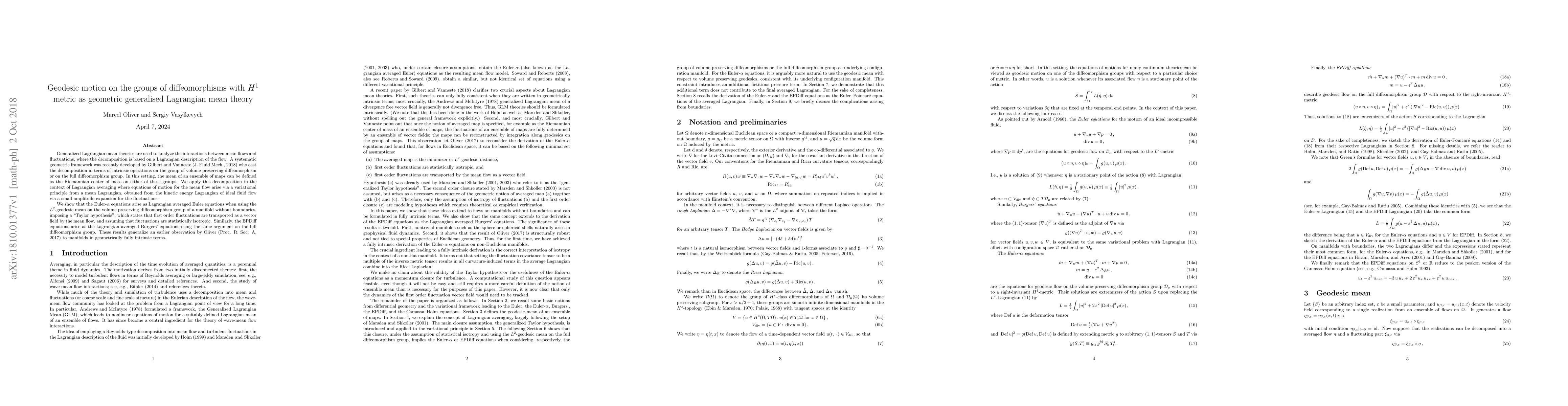 Generalized Lagrangian mean theories are used to analyze the interactions between mean flows and fluctuations, where the decomposition is based on a Lagrangian description of the flow. A systematic geometric framework was recently developed by Gilbert and Vanneste (J. Fluid Mech., 2018) who cast the decomposition in terms of intrinsic operations on the group of volume preserving diffeomorphism or on the full diffeomorphism group. In this setting, the mean of an ensemble of maps can be defined as the Riemannian center of mass on either of these groups. We apply this decomposition in the context of Lagrangian averaging where equations of motion for the mean flow arise via a variational principle from a mean Lagrangian, obtained from the kinetic energy Lagrangian of ideal fluid flow via a small amplitude expansion for the fluctuations. We show that the Euler-$\alpha$ equations arise as Lagrangian averaged Euler equations when using the $L^2$-geodesic mean on the volume preserving diffeomorphism group of a manifold without boundaries, imposing a `Taylor hypothesis', which states that first order fluctuations are transported as a vector field by the mean flow, and assuming that fluctuations are statistically isotropic. Similarly, the EPDiff equations arise as the Lagrangian averaged Burgers' equations using the same argument on the full diffeomorphism group. These results generalize an earlier observation by Oliver (Proc. R. Soc. A, 2017) to manifolds in geometrically fully intrinsic terms.