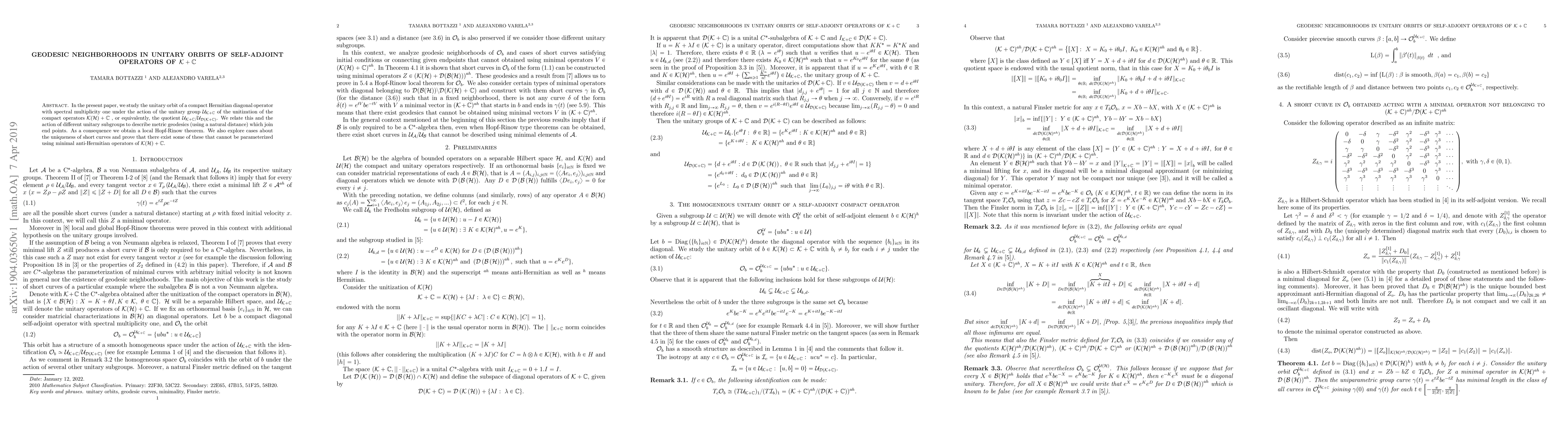 This paper explores the unitary orbit of a compact Hermitian diagonal operator under the action of the unitary group of its unitization, focusing on geodesics and metric properties. It establishes a local Hopf-Rinow theorem and discusses the uniqueness of short curves, proving the existence of some that cannot be parameterized by minimal anti-Hermitian operators.