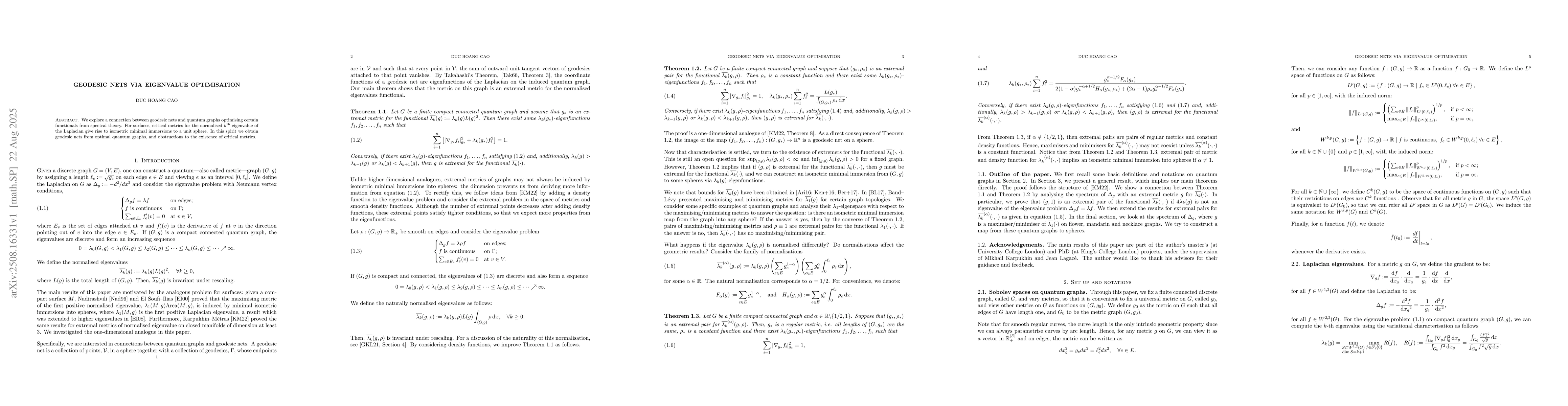 We explore a connection between geodesic nets and quantum graphs optimising certain functionals from spectral theory. For surfaces, critical metrics for the normalised $k^{\mathrm{th}}$ eigenvalue of the Laplacian give rise to isometric minimal immersions to a unit sphere. In this spirit we obtain geodesic nets from optimal quantum graphs, and obstructions to the existence of critical metrics.