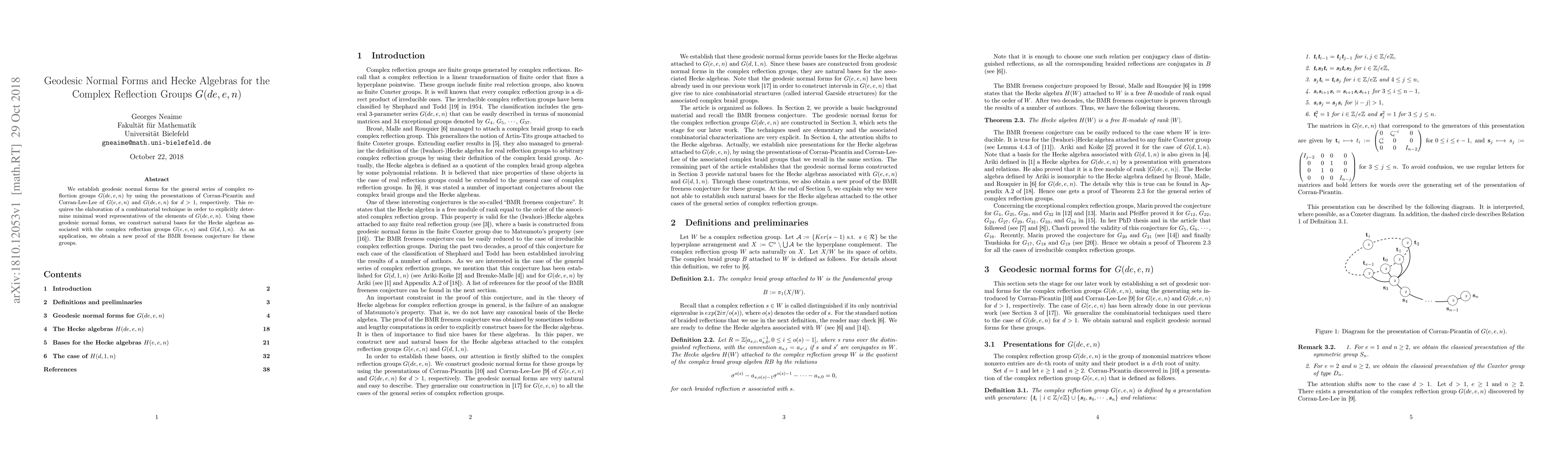 This paper establishes geodesic normal forms for complex reflection groups G(de,e,n) using combinatorial techniques, and constructs natural bases for their Hecke algebras, providing a new proof for the BMR freeness conjecture.