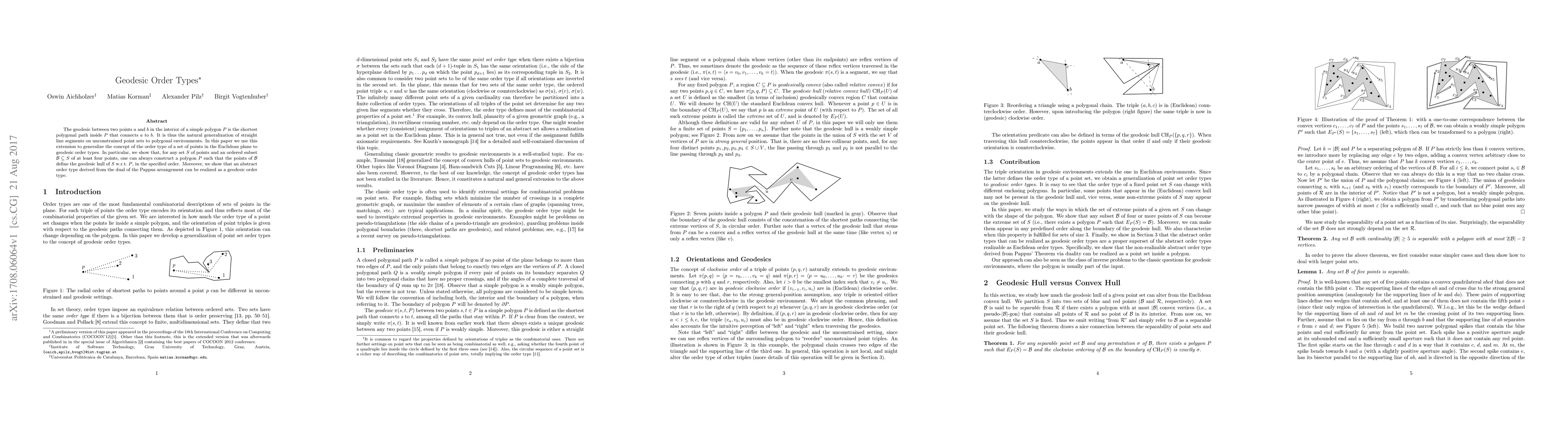 The geodesic between two points $a$ and $b$ in the interior of a simple polygon~$P$ is the shortest polygonal path inside $P$ that connects $a$ to $b$. It is thus the natural generalization of straight line segments on unconstrained point sets to polygonal environments. In this paper we use this extension to generalize the concept of the order type of a set of points in the Euclidean plane to geodesic order types. In particular, we show that, for any set $S$ of points and an ordered subset $\mathcal{B} \subseteq S$ of at least four points, one can always construct a polygon $P$ such that the points of $\mathcal{B}$ define the geodesic hull of~$S$ w.r.t.~$P$, in the specified order. Moreover, we show that an abstract order type derived from the dual of the Pappus arrangement can be realized as a geodesic order type.