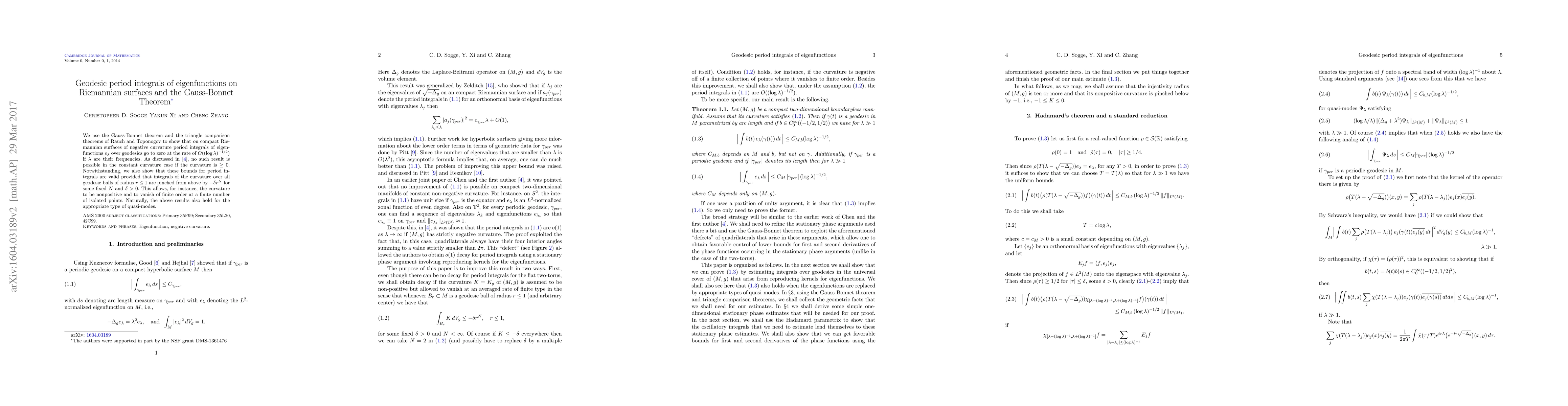 We use the Gauss-Bonnet theorem and the triangle comparison theorems of Rauch and Toponogov to show that on compact Riemann surfaces of negative curvature period integrals of eigenfunctions $e_\lambda$ over geodesics go to zero at the rate of $O((\log\lambda)^{-1/2})$ if $\lambda$ are their frequencies. As discussed in \cite{CSPer}, no such result is possible in the constant curvature case if the curvature is $\ge0$. Notwithstanding, we also show that these bounds for period integrals are valid provided that integrals of the curvature over all geodesic balls of radius $r\le 1$ are pinched from above by $-\delta r^N$ for some fixed $N$ and $\delta>0$. This allows, for instance, the curvature to be nonpositive and to vanish of finite order at a finite number of isolated points. Naturally, the above results also hold for the appropriate type of quasi-modes.