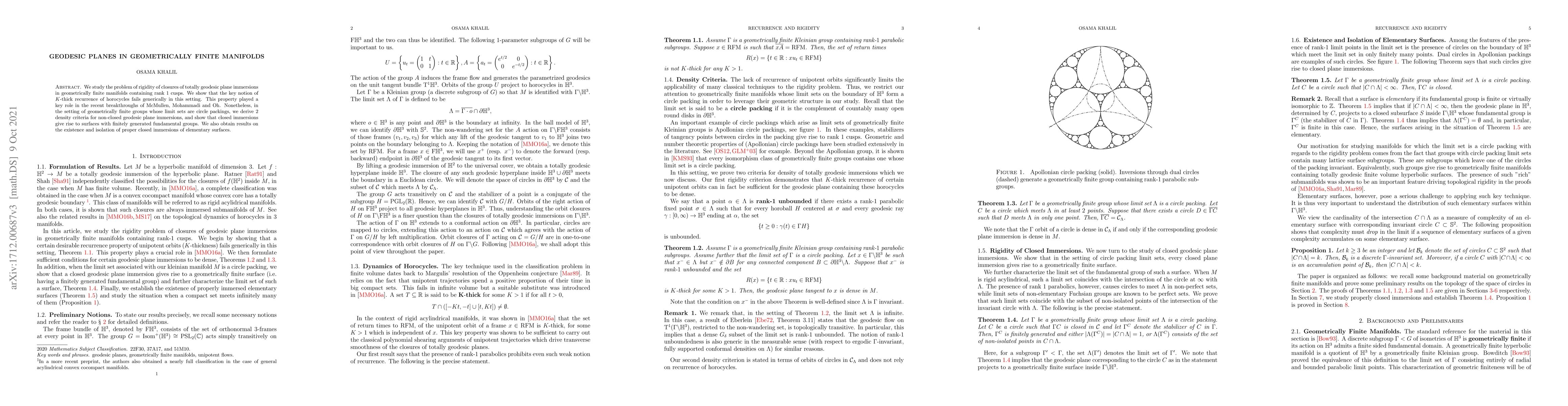 We study the problem of rigidity of closures of totally geodesic plane immersions in geometrically finite manifolds containing rank $1$ cusps. We show that the key notion of K-thick recurrence of horocycles fails generically in this setting. This property was introduced in the recent work of McMullen, Mohammadi and Oh. Nonetheless, in the setting of geometrically finite groups whose limit sets are circle packings, we derive 2 density criteria for non-closed geodesic plane immersions, and show that closed immersions give rise to surfaces with finitely generated fundamental groups. We also obtain results on the existence and isolation of proper closed immersions of elementary surfaces.