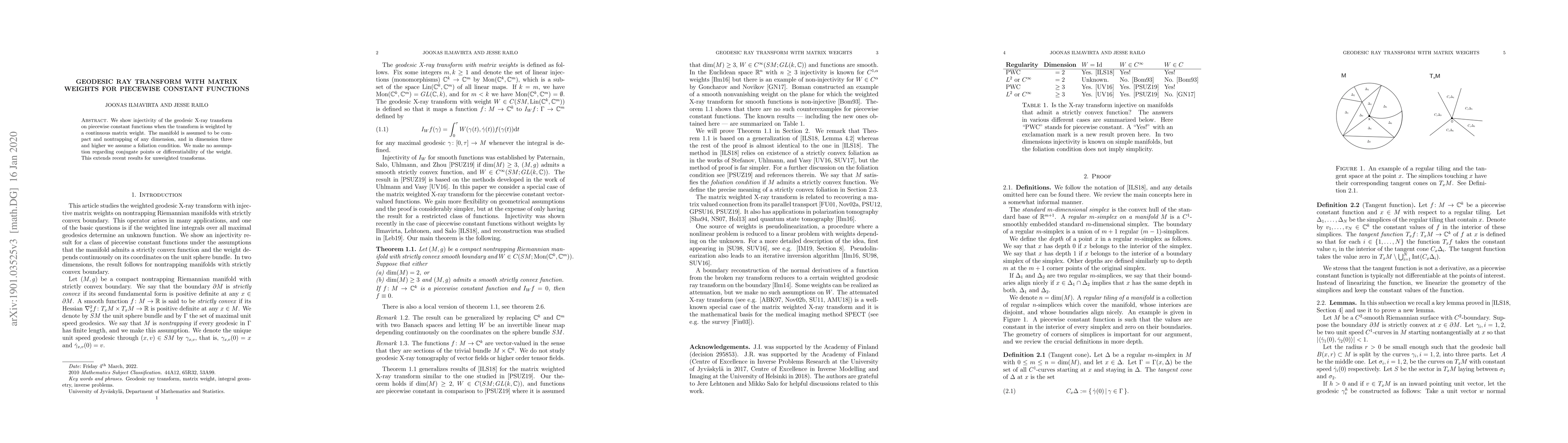 We show injectivity of the geodesic X-ray transform on piecewise constant functions when the transform is weighted by a continuous matrix weight. The manifold is assumed to be compact and nontrapping of any dimension, and in dimension three and higher we assume a foliation condition. We make no assumption regarding conjugate points or differentiability of the weight. This extends recent results for unweighted transforms.