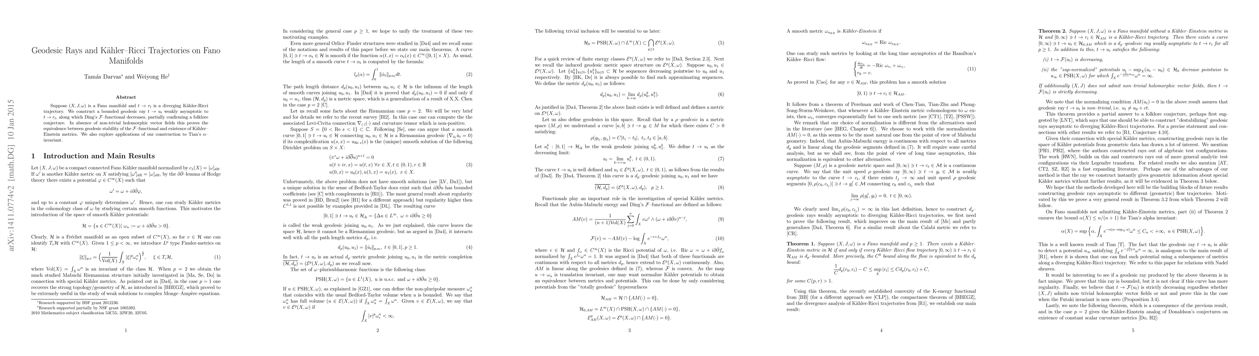 Suppose $(X,J,\omega)$ is a Fano manifold and $t \to r_t$ is a diverging K\"ahler-Ricci trajectory. We construct a bounded geodesic ray $t \to u_t$ weakly asymptotic to $t \to r_t$, along which Ding's $\mathcal F$-functional decreases, partially confirming a folklore conjecture. In absence of non-trivial holomorphic vector fields this proves the equivalence between geodesic stability of the $\mathcal F$-functional and existence of K\"ahler-Einstein metrics. We also explore applications of our construction to Tian's $\alpha$-invariant.