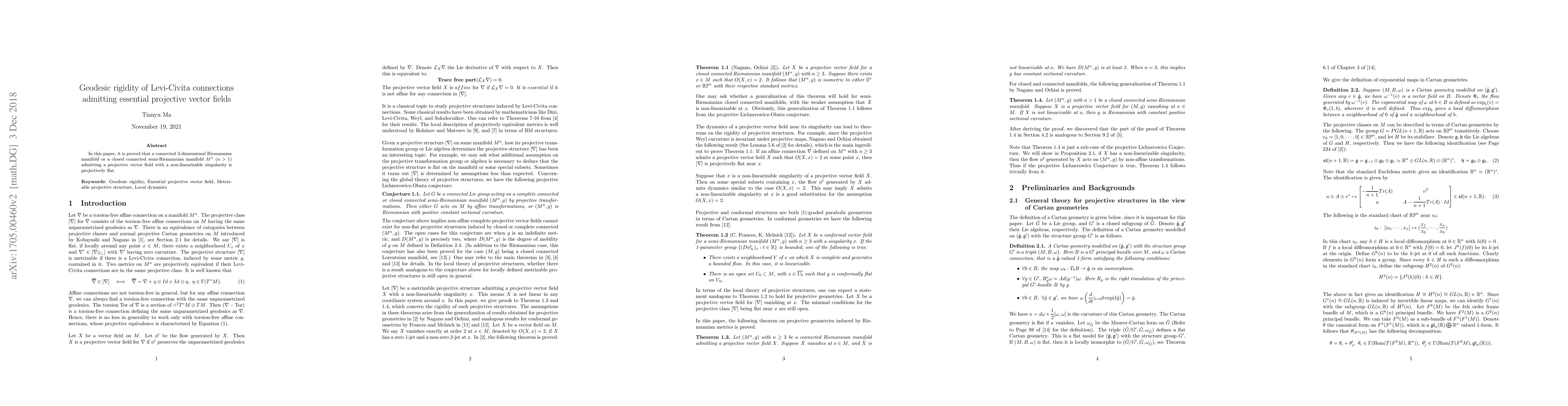 A connected 3D Riemannian manifold or closed semi-Riemannian manifold admitting a projective vector field with a non-linearizable singularity is guaranteed to be projectively flat.
