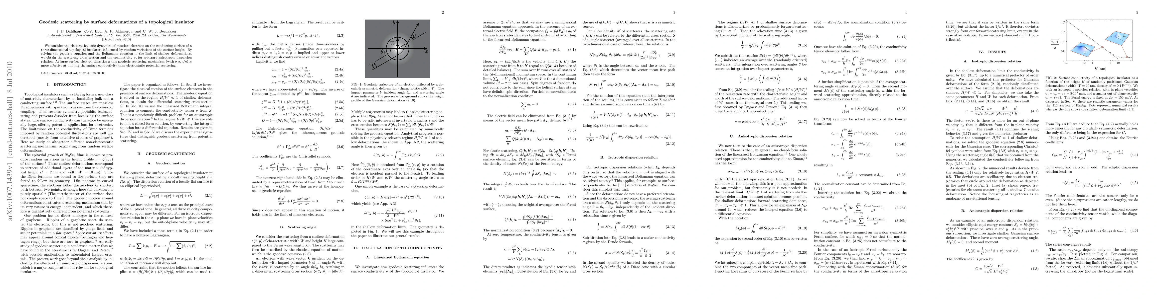 This paper investigates the scattering dynamics of massless electrons on a topological insulator's surface under random height variations, finding that geodesic scattering limits surface conductivity more effectively than electrostatic potential scattering at high electron densities. The study uses geodesic and Boltzmann equations to derive the scattering cross section and conductivity.