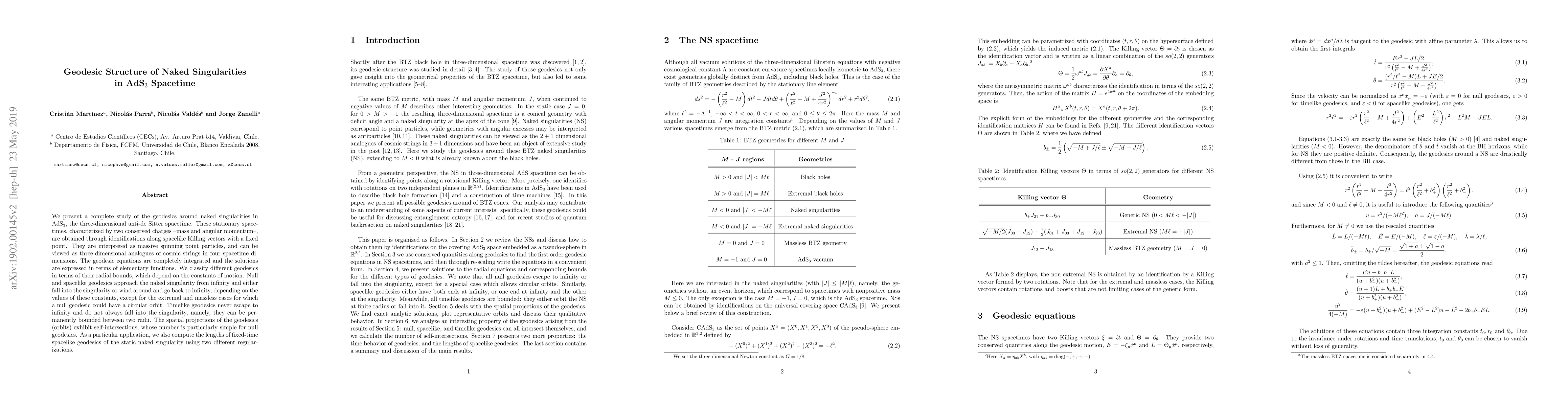 This paper studies geodesics in three-dimensional anti-de Sitter spacetime around naked singularities, classifying them based on their radial bounds and constants of motion. It finds that null and spacelike geodesics either escape to infinity or fall into the singularity, while timelike geodesics can remain bounded between two radii.