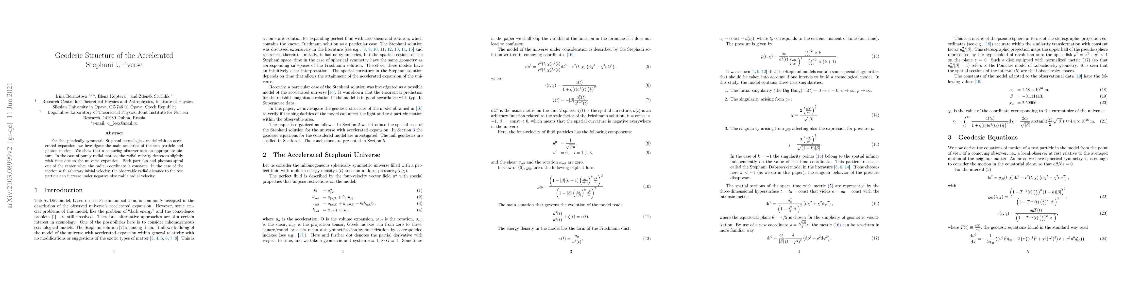 This paper examines the geodesic structure of the accelerated Stephani universe, focusing on the motion of test particles and photons. It reveals that a comoving observer perceives a consistent picture, with radial velocity decreasing over time due to cosmic expansion, and both particles and photons spiraling outward when radial coordinates are constant.