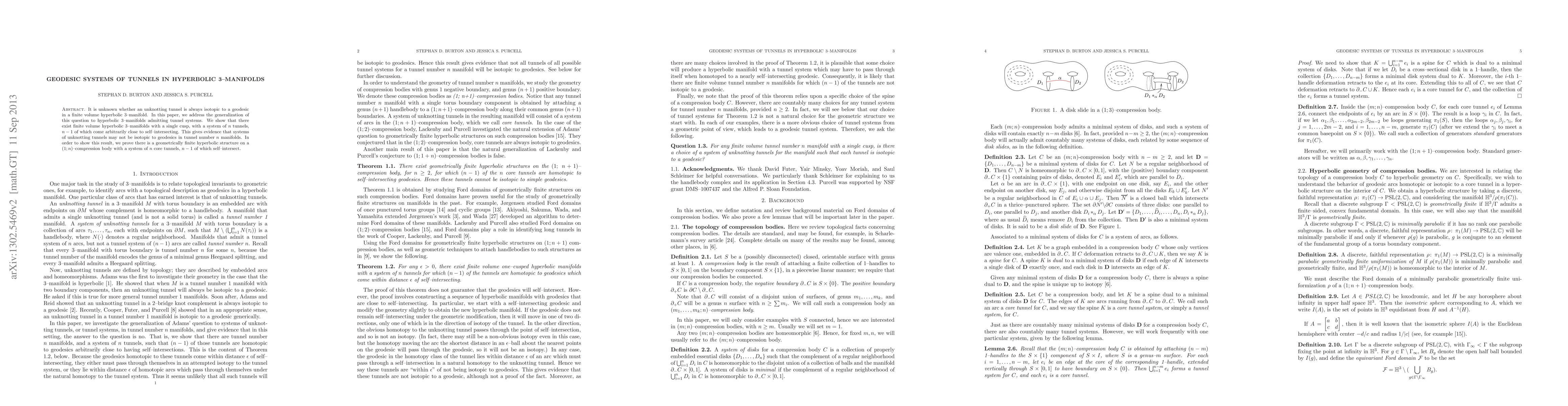 It is unknown whether an unknotting tunnel is always isotopic to a geodesic in a finite volume hyperbolic 3-manifold. In this paper, we address the generalization of this problem to hyperbolic 3-manifolds admitting tunnel systems. We show that there exist finite volume hyperbolic 3-manifolds with a single cusp, with a system of at least two tunnels, such that all but one of the tunnels come arbitrarily close to self-intersecting. This gives evidence that systems of unknotting tunnels may not be isotopic to geodesics in tunnel number n manifolds. In order to show this result, we prove there is a geometrically finite hyperbolic structure on a (1;n)-compression body with a system of core tunnels such that all but one of the core tunnels self-intersect.