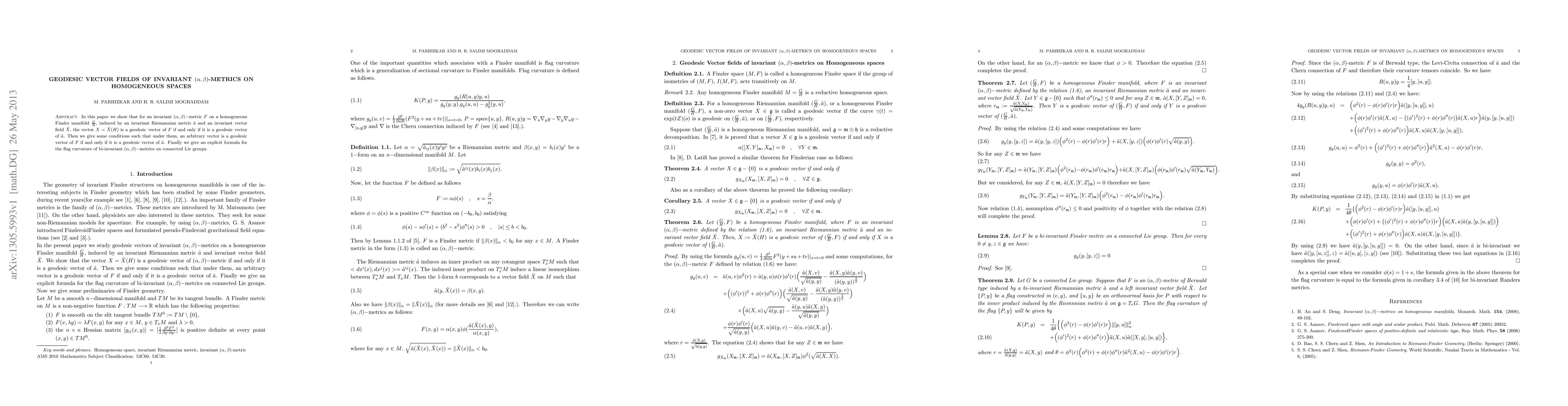 In this paper we show that for an invariant $(\alpha,\beta)-$metric $F$ on a homogeneous Finsler manifold $\frac{G}{H}$, induced by an invariant Riemannian metric $\tilde{a}$ and an invariant vector field $\tilde{X}$, the vector $X=\tilde{X}(H)$ is a geodesic vector of $F$ if and only if it is a geodesic vector of $\tilde{a}$. Then we give some conditions such that under them, an arbitrary vector is a geodesic vector of $F$ if and only if it is a geodesic vector of $\tilde{a}$. Finally we give an explicit formula for the flag curvature of bi-invariant $(\alpha,\beta)-$metrics on connected Lie groups.