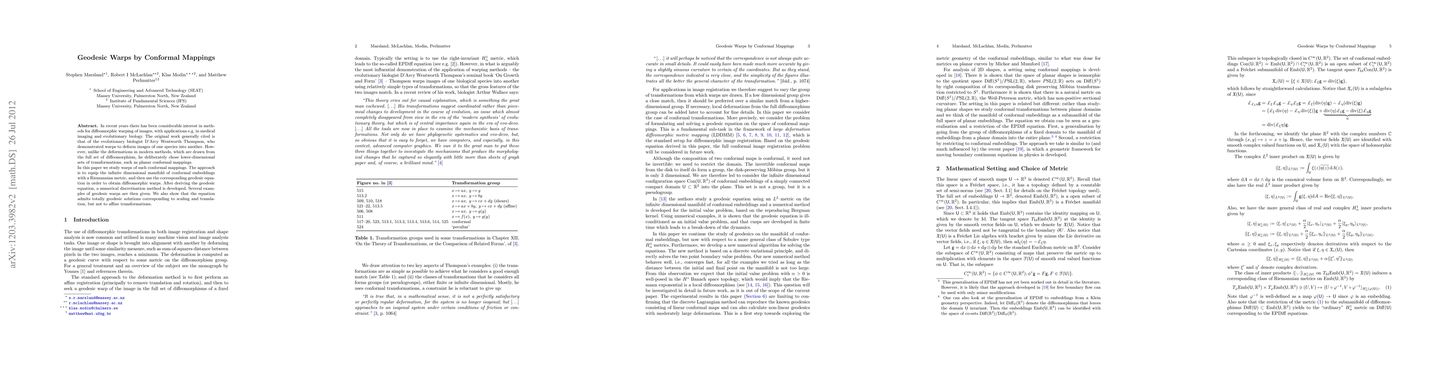 This paper develops a method for geodesic warps using conformal mappings, enabling diffeomorphic transformations of images. It shows that the approach admits scaling and translation solutions but not affine transformations.