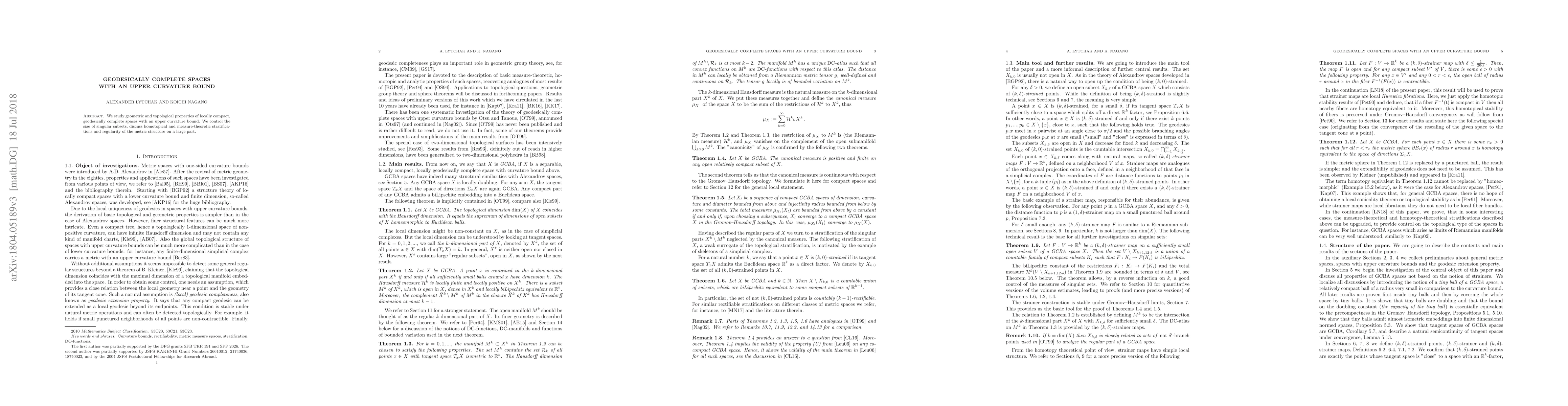 This paper investigates the geometric and topological characteristics of locally compact, geodesically complete spaces with an upper curvature bound, focusing on the size of singular subsets, and exploring homotopical and measure-theoretic stratifications along with the regularity of the metric structure.