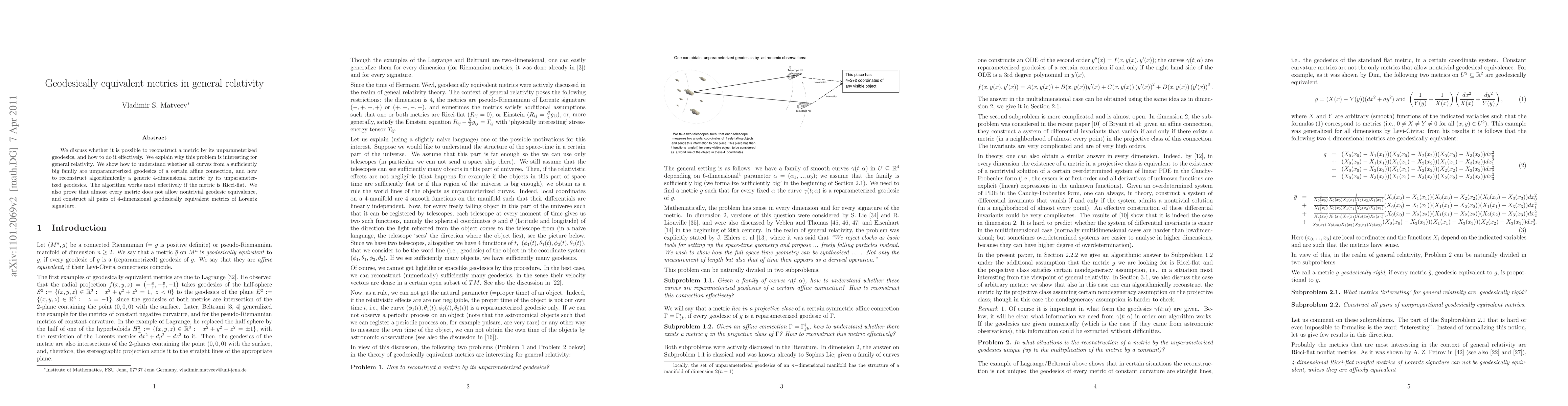 This paper explores the reconstruction of a metric from its unparameterized geodesics, demonstrating an effective algorithm for this purpose, particularly effective for Ricci-flat metrics. It also proves that most metrics do not allow nontrivial geodesic equivalence and identifies all pairs of geodesically equivalent 4-dimensional metrics with Lorenz signature.