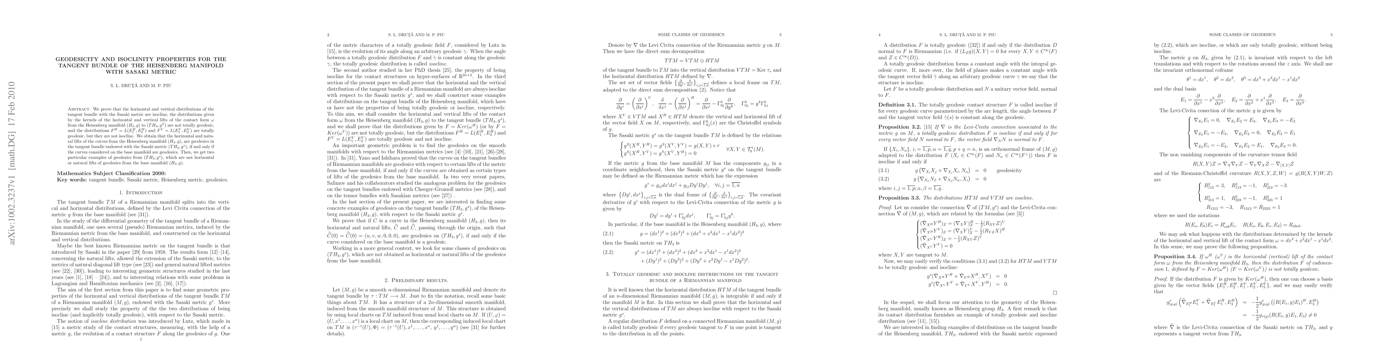 We prove that the horizontal and vertical distributions of the tangent bundle with the Sasaki metric are isocline, the distributions given by the kernels of the horizontal and vertical lifts of the contact form $\omega$ from the Heisenberg manifold $(H_3,g)$ to $(TH_3,g^S)$ are not totally geodesic, and the distributions $F^H=L(E_1^H,E_2^H)$ and $F^V=L(E_1^V,E_2^V)$ are totally geodesic, but they are not isocline. We obtain that the horizontal and natural lifts of the curves from the Heisenberg manifold $(H_3,g)$, are geodesics in the tangent bundle endowed with the Sasaki metric $(TH_3,g^s)$, if and only if the curves considered on the base manifold are geodesics. Then, we get two particular examples of geodesics from $(TH_3,g^s)$, which are not horizontal or natural lifts of geodesics from the base manifold $(H_3,g)$.