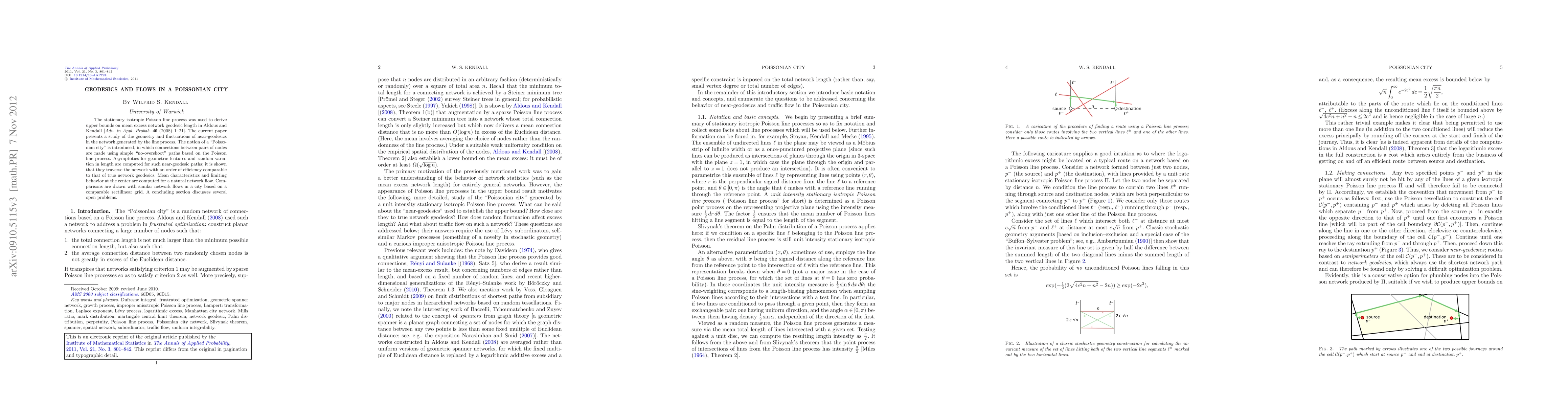 The stationary isotropic Poisson line process was used to derive upper bounds on mean excess network geodesic length in Aldous and Kendall [Adv. in Appl. Probab. 40 (2008) 1-21]. The current paper presents a study of the geometry and fluctuations of near-geodesics in the network generated by the line process. The notion of a "Poissonian city" is introduced, in which connections between pairs of nodes are made using simple "no-overshoot" paths based on the Poisson line process. Asymptotics for geometric features and random variation in length are computed for such near-geodesic paths; it is shown that they traverse the network with an order of efficiency comparable to that of true network geodesics. Mean characteristics and limiting behavior at the center are computed for a natural network flow. Comparisons are drawn with similar network flows in a city based on a comparable rectilinear grid. A concluding section discusses several open problems.