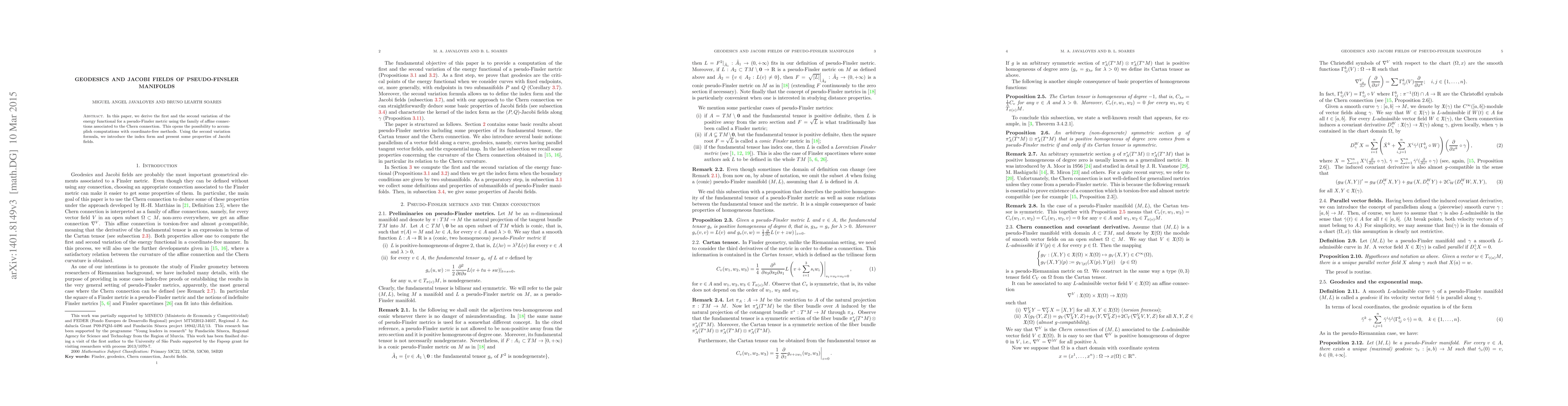 This paper derives the first and second variation of the energy functional for pseudo-Finsler metrics, employing affine connections from the Chern connection. It introduces the index form and discusses properties of Jacobi fields using coordinate-free methods.