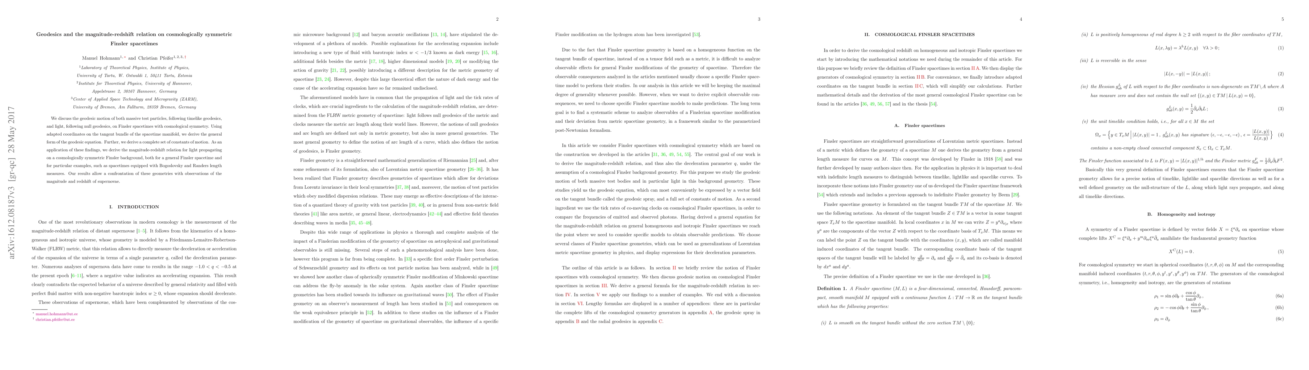 This paper explores geodesic motion in cosmologically symmetric Finsler spacetimes, deriving the general form of the geodesic equation and a set of constants of motion. It applies these findings to derive the magnitude-redshift relation for light, comparing general Finsler spacetimes with specific examples like Bogoslovsky and Randers metrics, and enabling observational tests against supernova data.