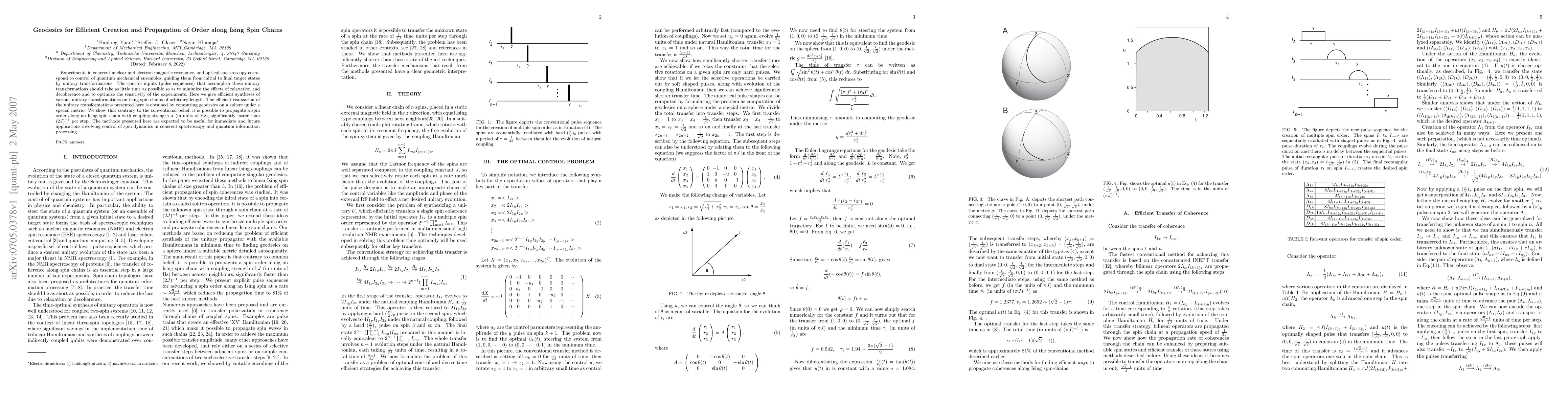 This paper presents efficient methods for creating and propagating order along Ising spin chains using geodesics on a special metric sphere, achieving faster-than-conventional propagation rates. The proposed techniques aim to optimize quantum control in spectroscopy and quantum information processing by minimizing relaxation and decoherence effects.