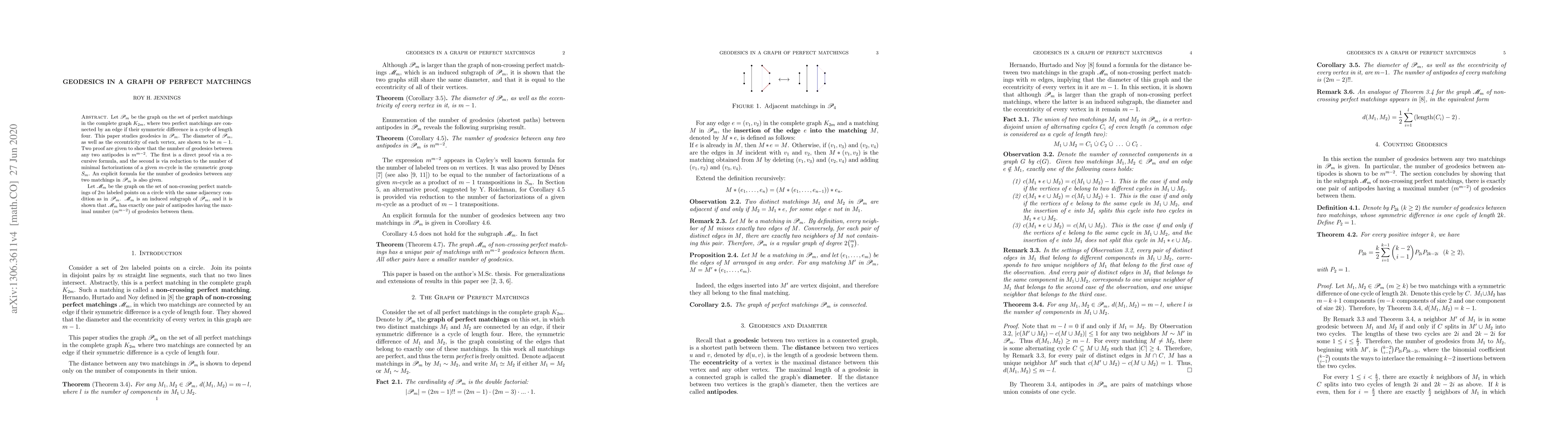 Let $\mathscr{P}_{m}$ be the graph on the set of perfect matchings in the complete graph $K_{2m}$, where two perfect matchings are connected by an edge if their symmetric difference is a cycle of length four. This paper studies geodesics in $\mathscr{P}_{m}$. The diameter of $\mathscr{P}_{m}$, as well as the eccentricity of each vertex, are shown to be $m-1$. Two proof are given to show that the number of geodesics between any two antipodes is $m^{m-2}$. The first is a direct proof via a recursive formula, and the second is via reduction to the number of minimal factorizations of a given $m$-cycle in the symmetric group $S_m$. An explicit formula for the number of geodesics between any two matchings in $\mathscr{P}_{m}$ is also given. Let $\mathscr{M}_m$ be the graph on the set of non-crossing perfect matchings of $2m$ labeled points on a circle with the same adjacency condition as in $\mathscr{P}_m$. $\mathscr{M}_m$ is an induced subgraph of $\mathscr{P}_m$, and it is shown that $\mathscr{M}_m$ has exactly one pair of antipodes having the maximal number ($m^{m-2}$) of geodesics between them.
